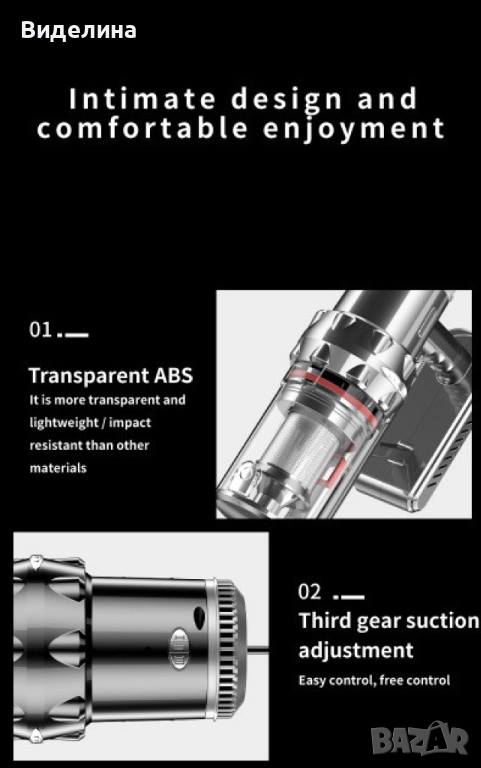 Материал: Прозрачен ABS; Регулиране на Аспиратора: Трета предавка; Контрол на Включване: Задържане за 2 секунди за стартиране; Дизайн за Намаляване на Шума: Циклонен канал; Дизайн на Съхранение: Стенен дизайн; Вариант 1: С кабел; Вариант 2: С батерия; Въртящ Се: Да.