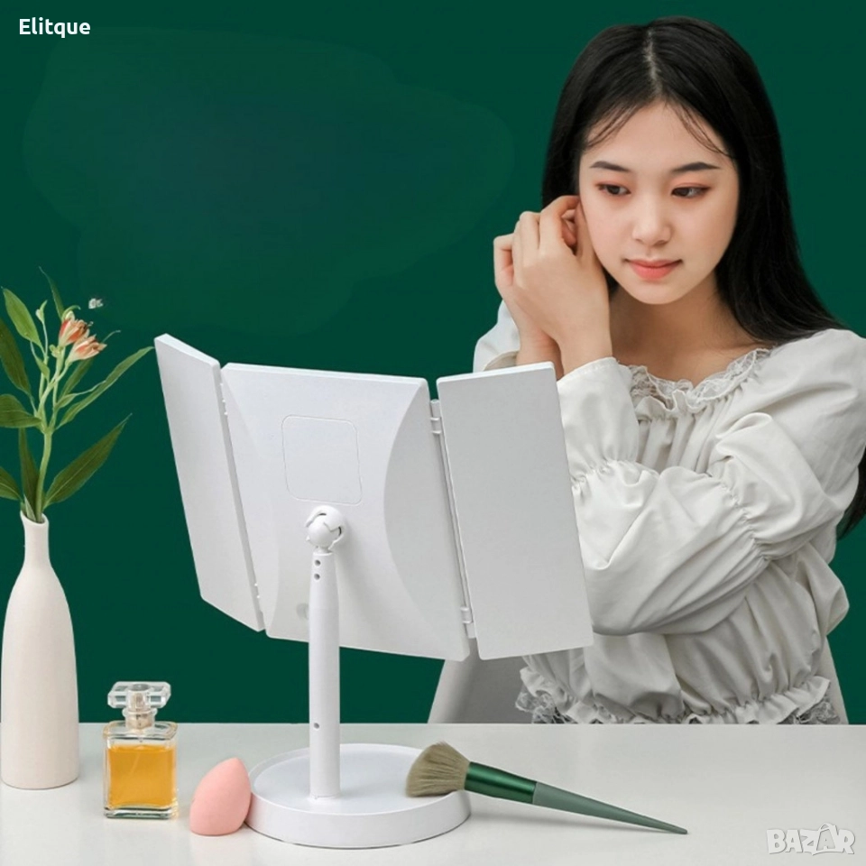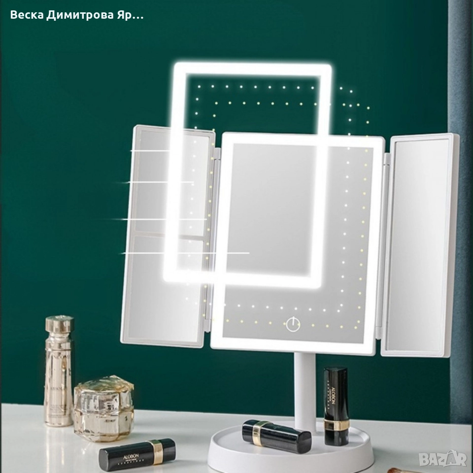 Материал на рамката: ABS. Основни характеристики: Троен сгъваем дизайн: Трите панела ви осигуряват панорамен изглед, за да виждате лицето си от всеки ъгъл. Страничните огледала са перфектни за прецизно нанасяне на очна линия или контуриране. LED осветление със сензорен бутон: Централното огледало е обградено от ярка, но щадяща очите LED лента. Включването и регулирането на светлината става само с едно докосване на интегрирания сензор. Стабилна стойка с органайзер: Кръглата основа не само държи огледалото стабилно, но и служи като удобна поставка за вашите любими червила, бижута или аксесоари. Цвят: Бял.