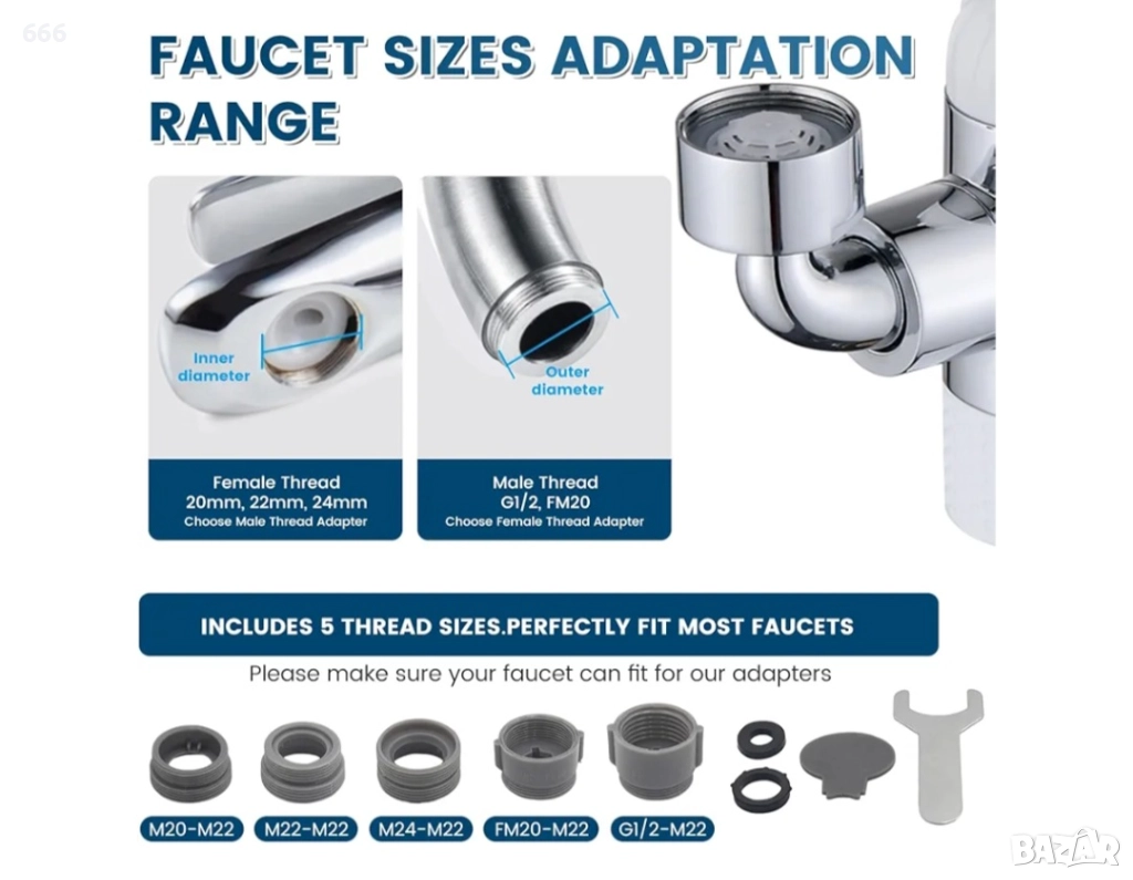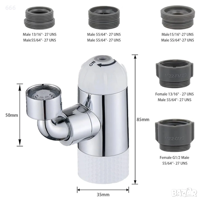 🔧Универсална съвместимост с допълнителни адаптери – Главата на смесителя е със стандартен интерфейс G1/2, което я прави съвместима с повечето домакински смесители. Предлага се с множество адаптери за преобразуване в мъжки и женски размери, включително 55/64"-27 UNS (22 мм), G1/2 (22 мм) и други.