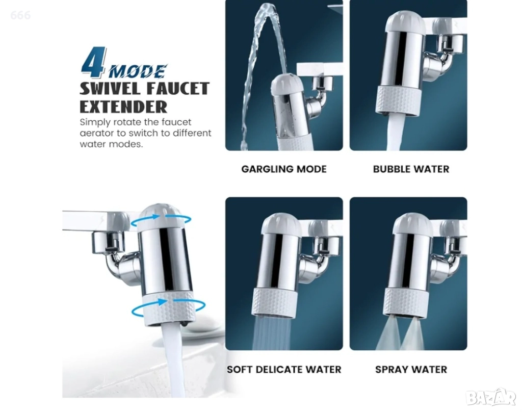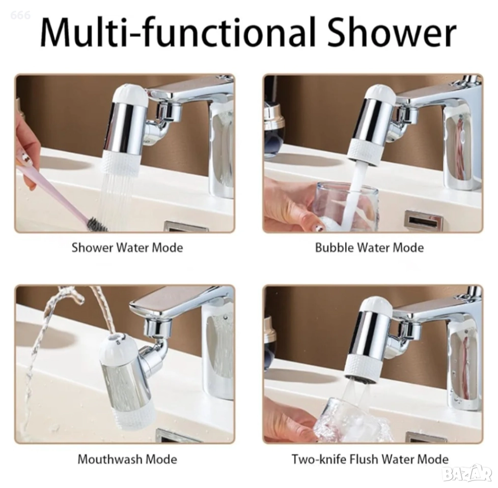 Приставка за кран с 4 функции за пръскане, въртящ се на 720°