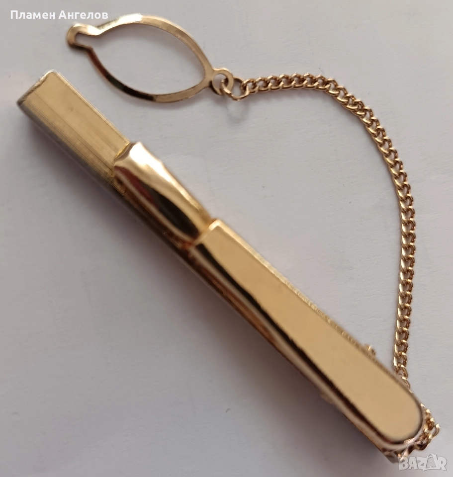Щипка, игла за вратовръзка. Аксесоар в златист цвят. Класически дизайн, с диогонални линии в средата на основната част. Нова, неупотребявана. В отлично състояние със производствения си блясък. Стилна, луксозна, уникална щипка.