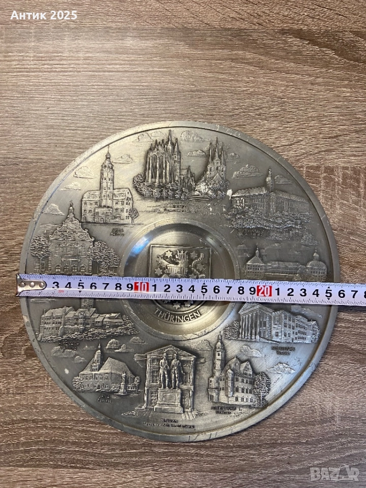 Голямо винтидж декоративно пано от метал (пютър/оловна сплав) с детайлен релеф, посветен на германската провинция Тюрингия (Thüringen). В центъра е изобразен гербът на Тюрингия, а по периферията – емблематични градове и архитектурни забележителности от региона: Ваймар (паметникът на Гьоте и Шилер), Йена, Айзенах (Вартбург), Ерфурт, Гота, Майнинген, Алтенбург и други.