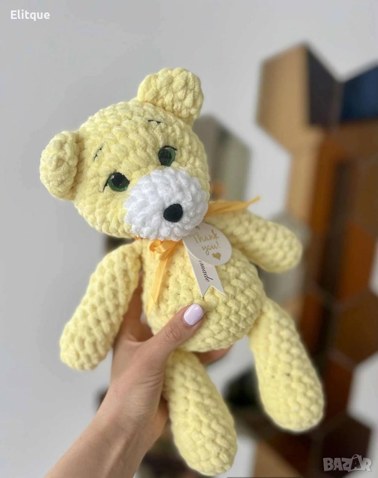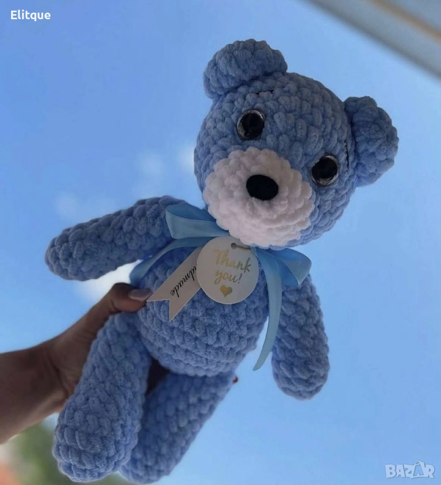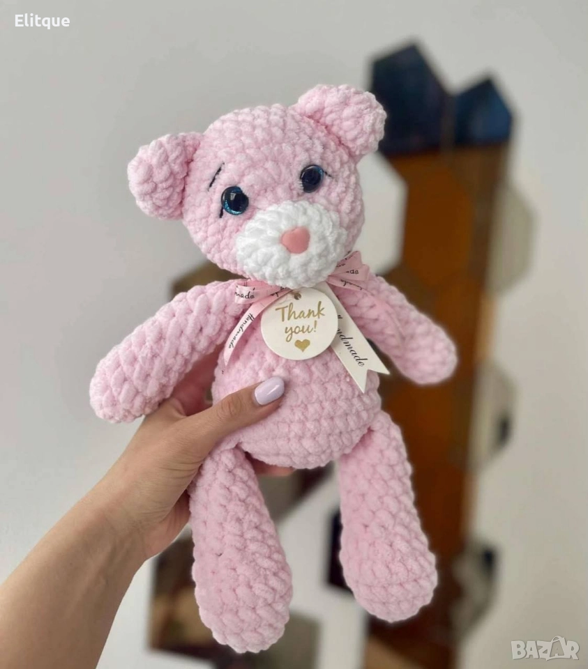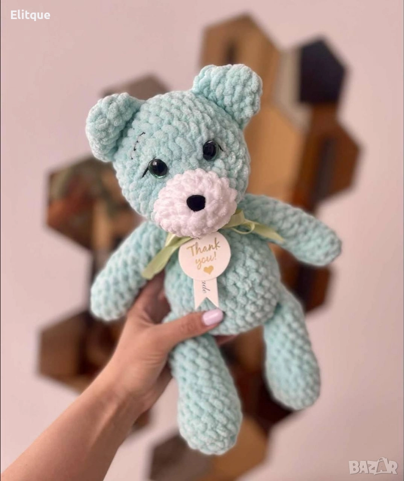 Ръчно плетени мечета от хипоалергенен пух и мека прежда Обезопасени очички и носле,подходящи за деца Размер 31-32см Пране на ръка или в пералня до 30 градуса Цена:55лв Срок на изработка 5 работни дни