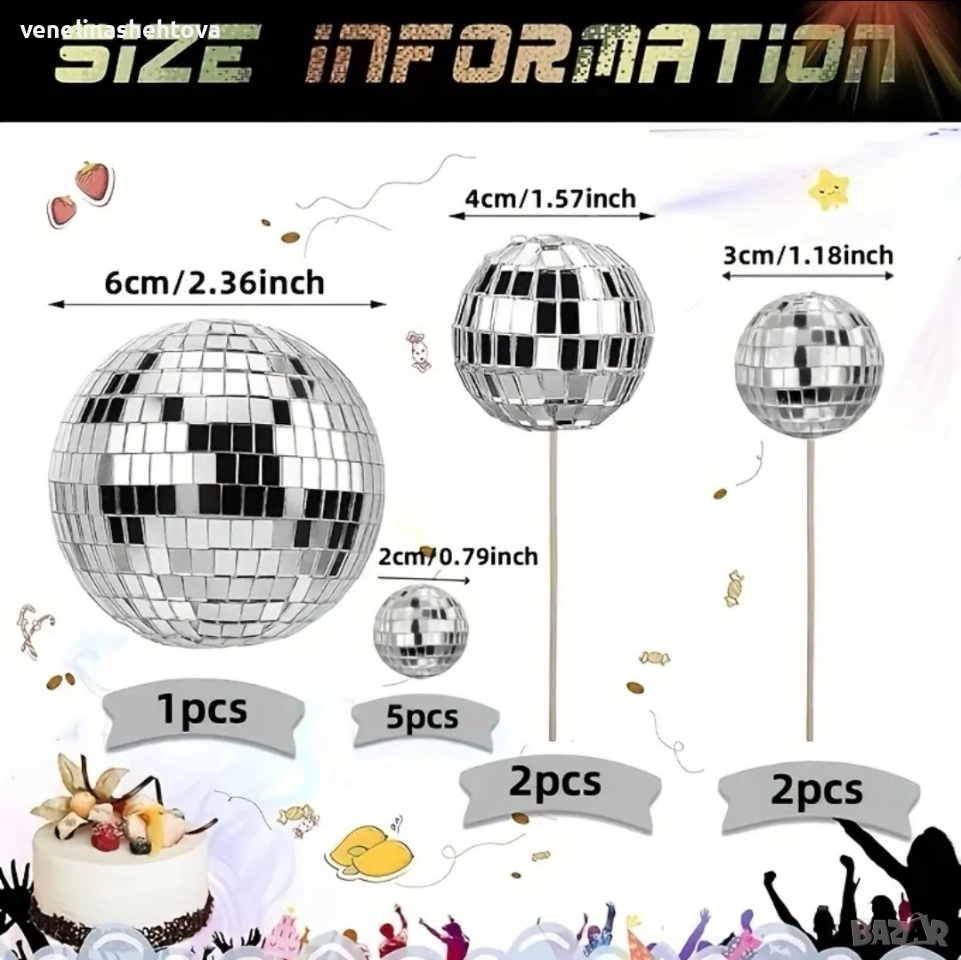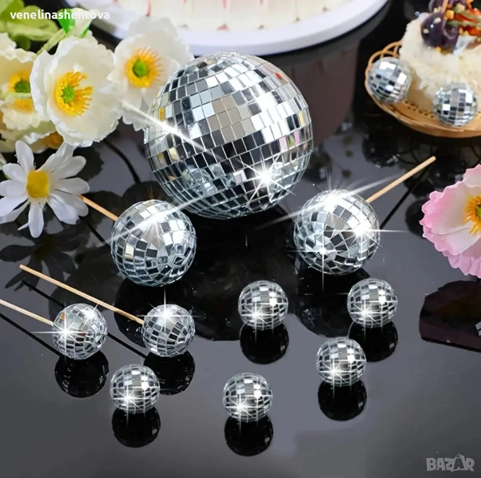 10 броя огледални диско топки на клечка декорация на торта → Обява 52942259