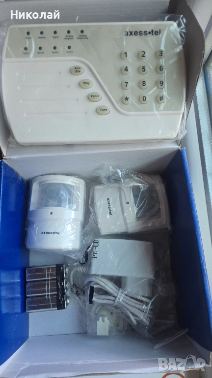 1 бр. модул за главно управление, 2 бр. датчици за движение, 2 бр. скоби/винтове, 2 бр. ръководство за употреба на български и английски, 1 бр. DC адаптер, 3 бр. 9V батерии и гаранционна карта.