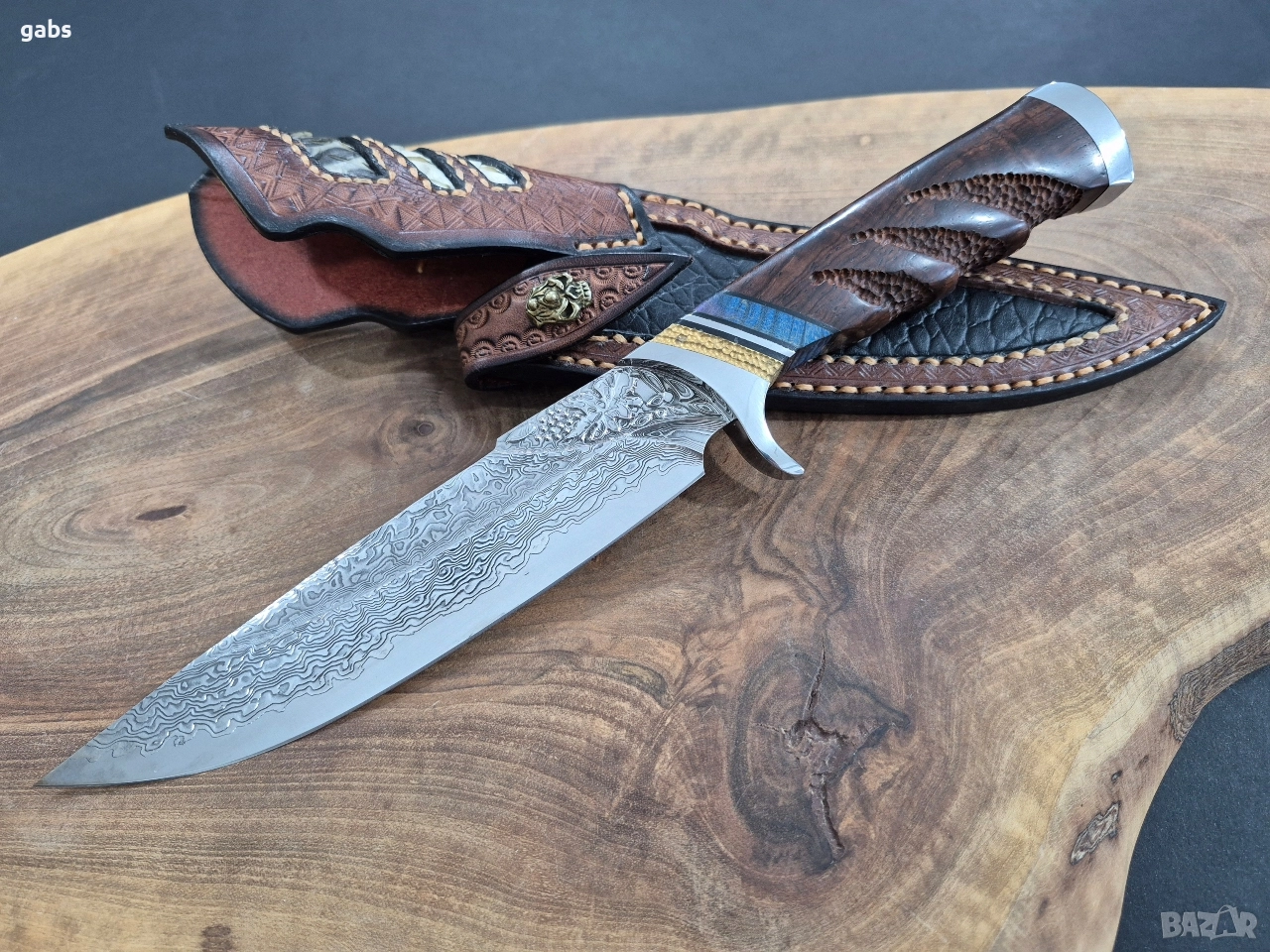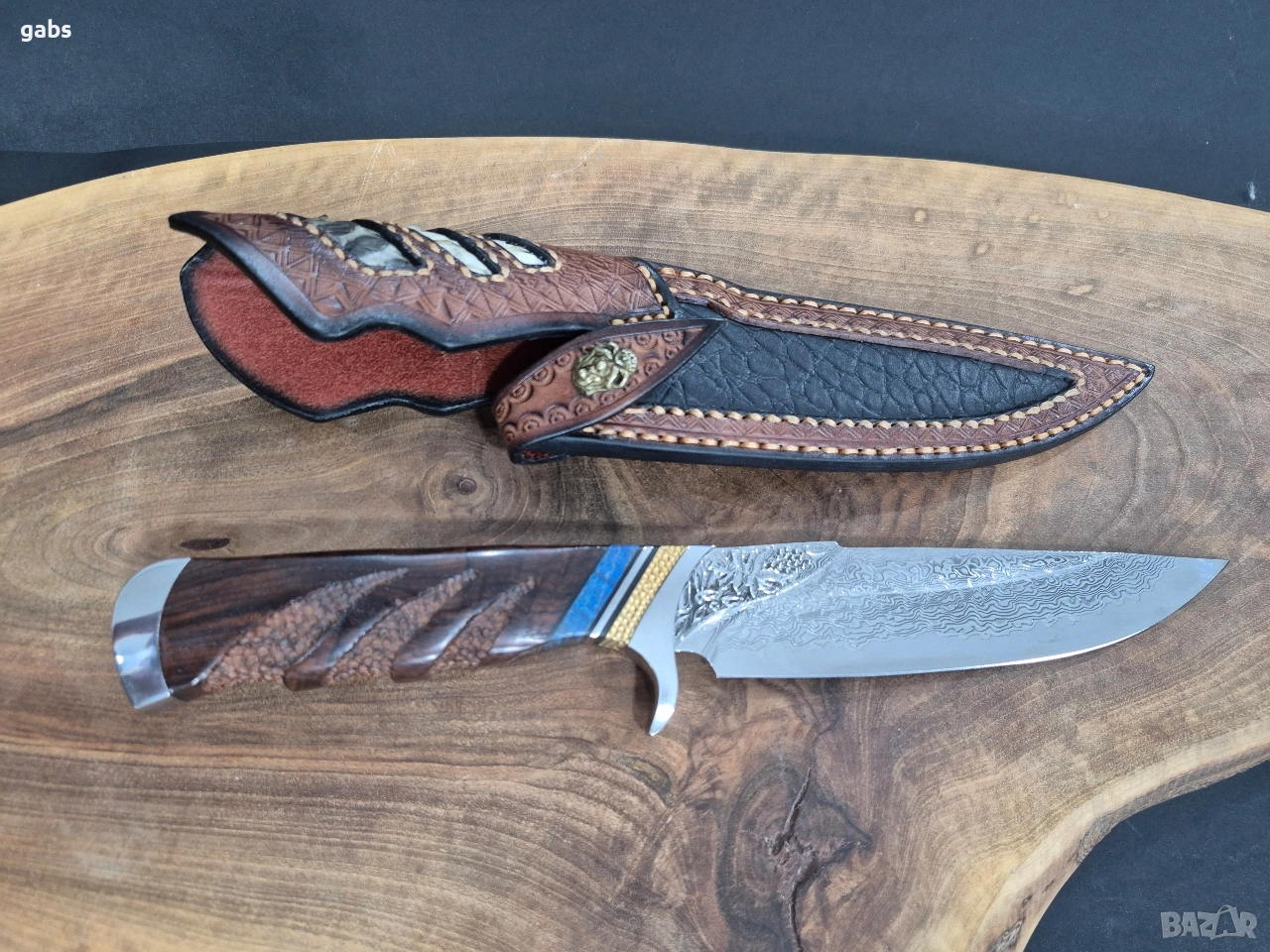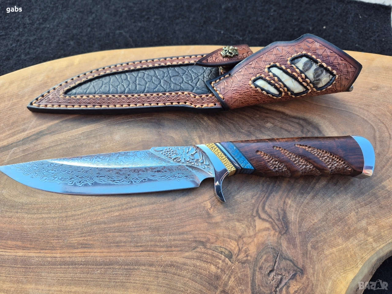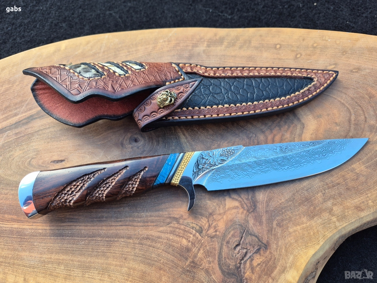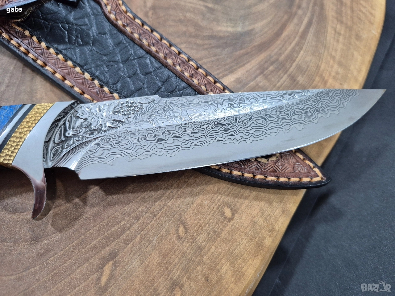 ловен нож дамаска VG10 стомана с кожена кания.С красиво гравирано острие и уникална многокомпонентна дръжка.Визията се допълва от изящна кожена кания.