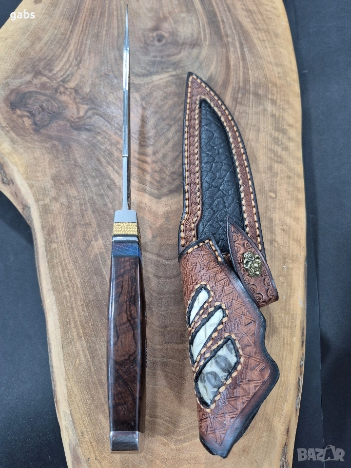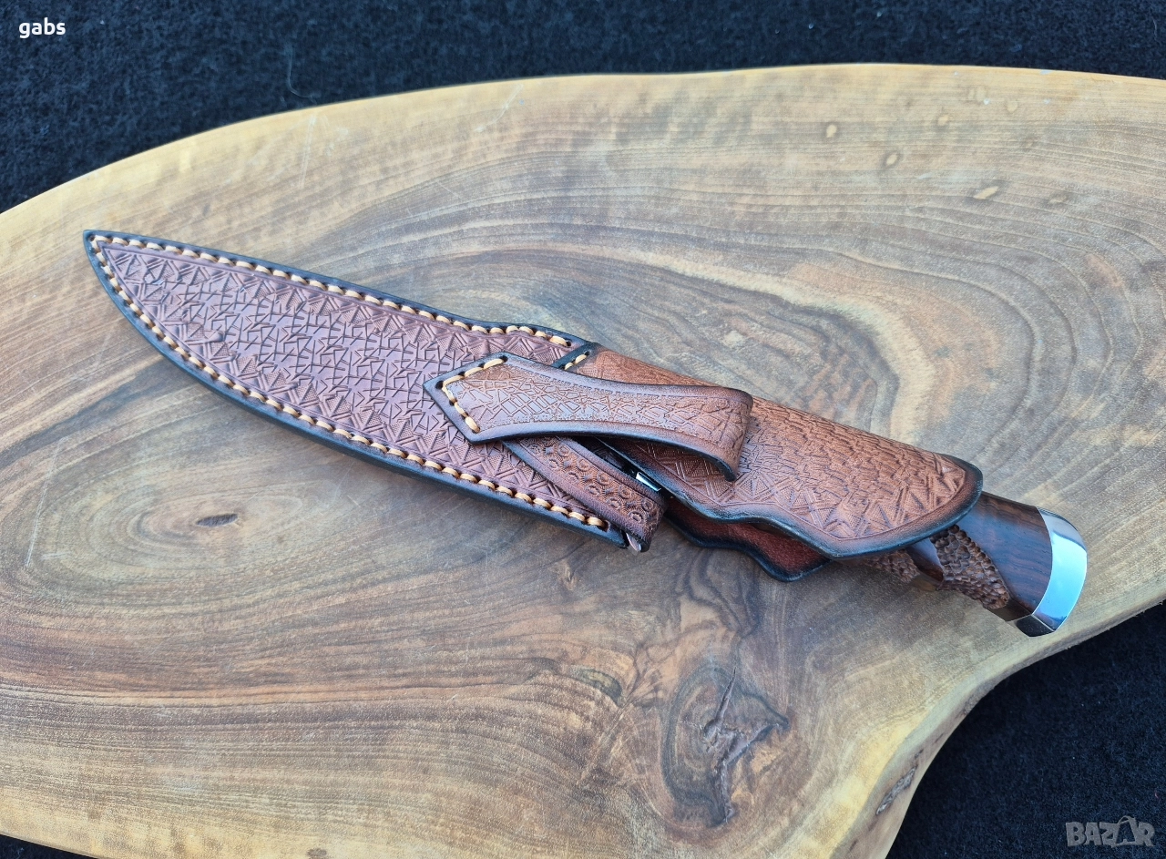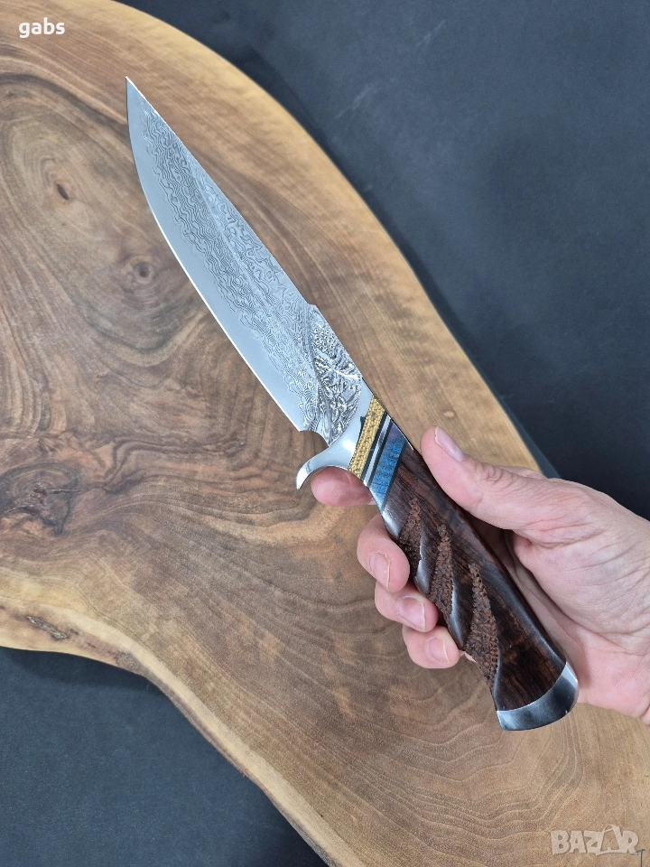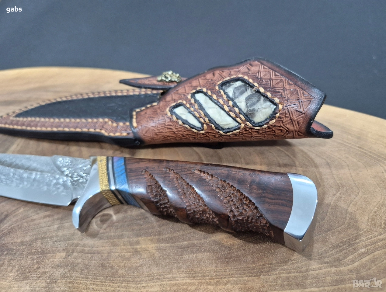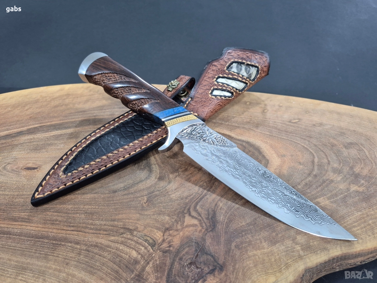 ловен нож дамаска VG10 стомана с кожена кания.С красиво гравирано острие и уникална многокомпонентна дръжка.Визията се допълва от изящна кожена кания.