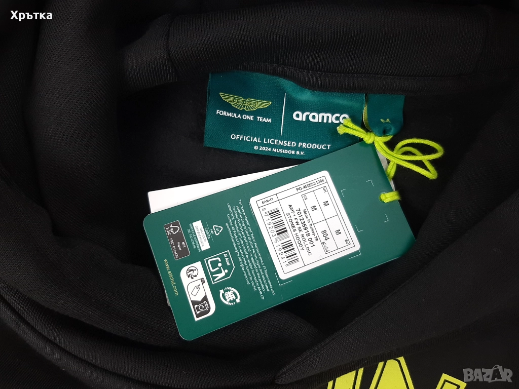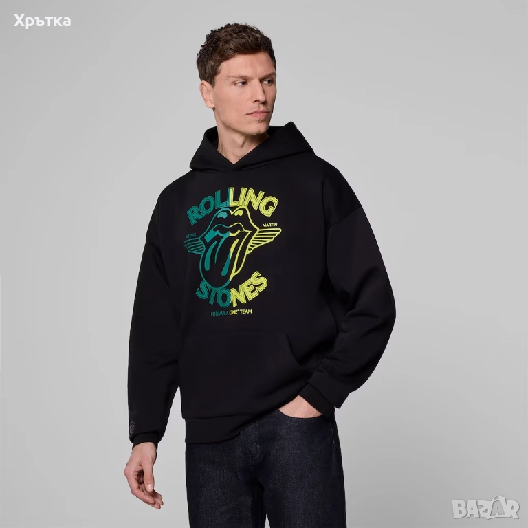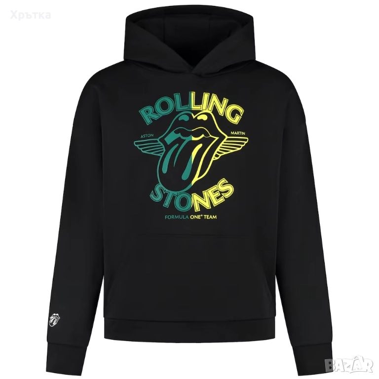Оригинален мъжки суитшърт Aston Martin F1 x Rolling Stones Team Hoodie размер по етикет M, модела е oversized, стои свободно, може да стане и за размер L-XL