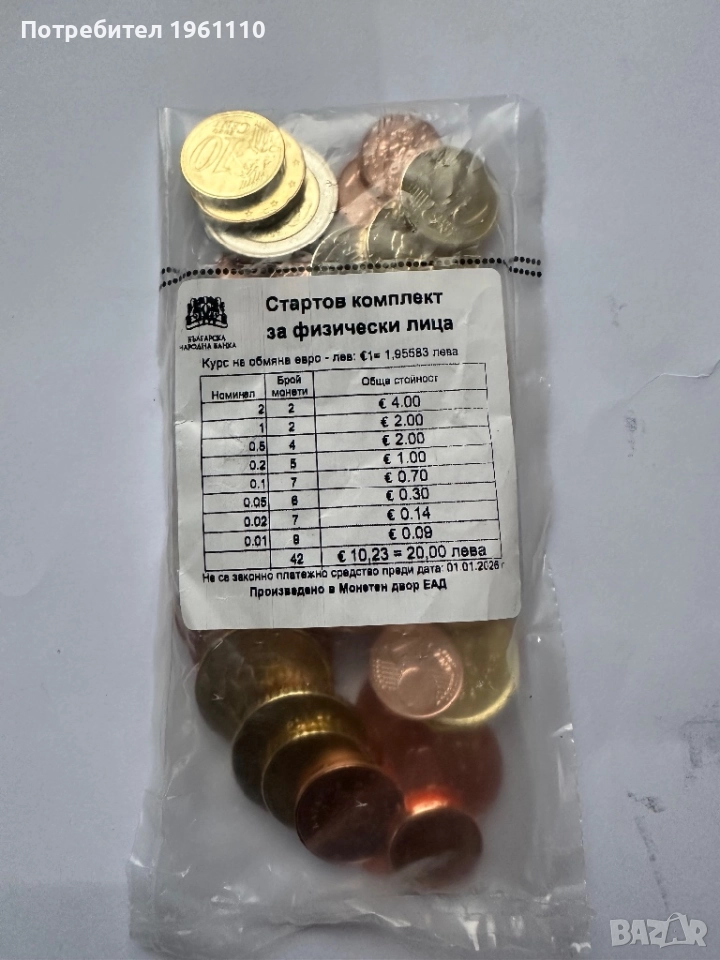ЗА КОЛЕКЦИОНЕРИ! Продавам чисто нов Стартов комплект евро-монети за физически лица, издаден от Българската народна банка. Пакетът е фабрично запечатан и съдържа 42 монети с обща стойност €10,23 (еквивалент на 20 лв по официалния курс).