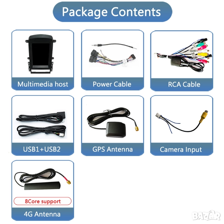 Пълен комплект с цялата рамка, преходни кабели и букси, декодери, предназначени и съвместими за монтиране на конкретния модел автомобил.
