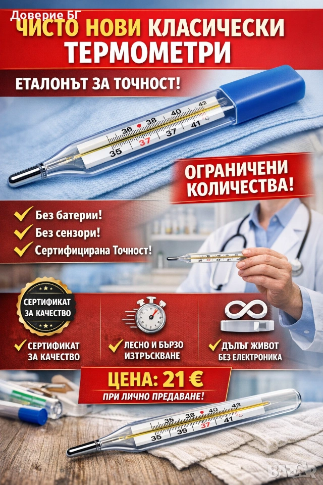 Чисто нови термометри от стария, доказан тип. Класиката, която дава най-точното измерване на телесната температура и по която се сравняват всички други термометри. Това не са електронни устройства, които грешат или зависят от батерии. Стария термометър остава най-надеждният избор за хора, които не правят компромис със здравето си. Предимства: – максимална точност – сертификат за качество – изтръскват се лесно и бързо, без усилие – дълъг живот, без електроника и консумативи Подходящи за домашна употреба, лекарски кабинети, аптеки и хора, които знаят какво купуват. Все по-трудни за намиране, налични в ограничени количества. Цена: 40 лв. при лично предаване при изпращане с куриер цената е +20%