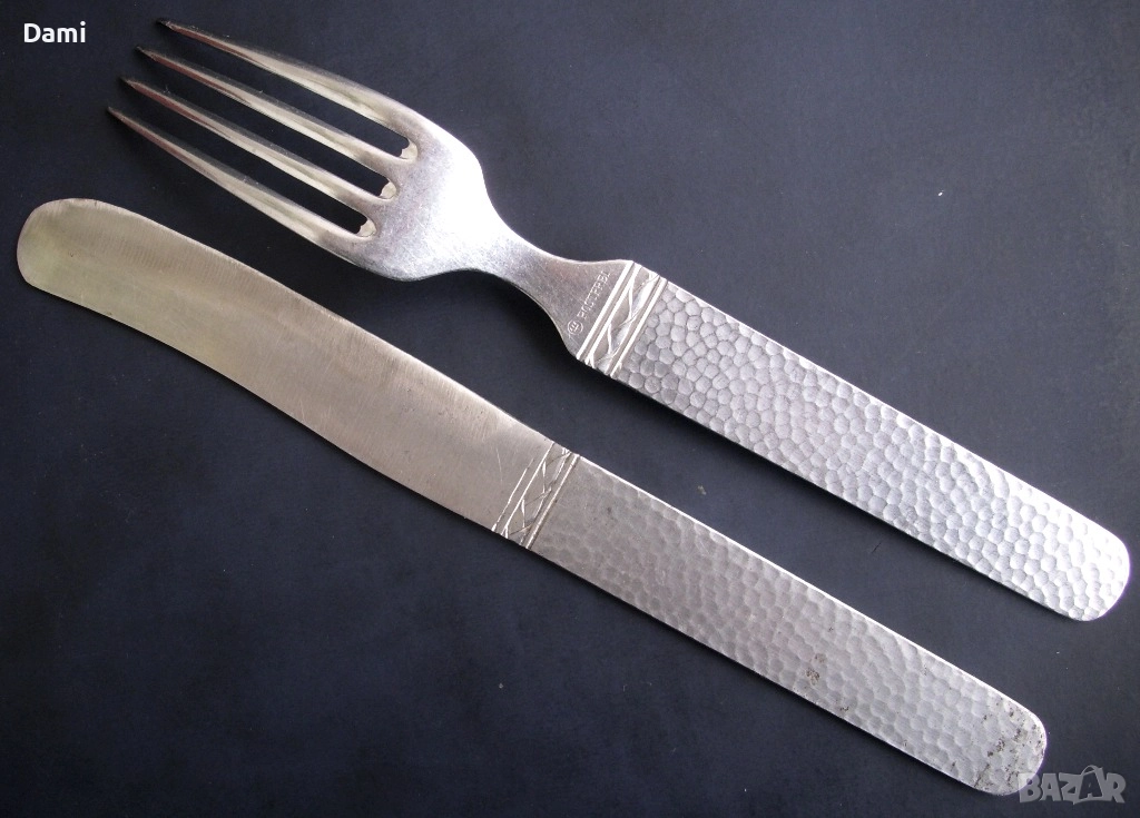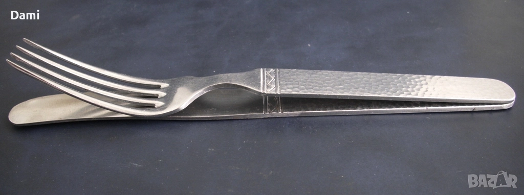 Туристически прибори за хранене нож и вилица, предвоенно производство на Wüsthof, Dreizackwerk, Solingen, Германия (1930-1939 год). Компанията е основана преди 200 години и е един от най-старите производители на прибори, които съществуват до днес и е символ на безкомпромисно качество. Приборите са маркирани с логото Dreizack и надпис "rostfrei". Много компактни, отлично запазени, годни за употреба по предназначение, по дръжката на ножа има леки следи от времето, видно от снимките, острието без забележки. Размери: обща дължина 18 см, дължина на дръжките 9 см, ширина на дръжките 1,5 см, ширина на вилицата в основата 2,5 см.