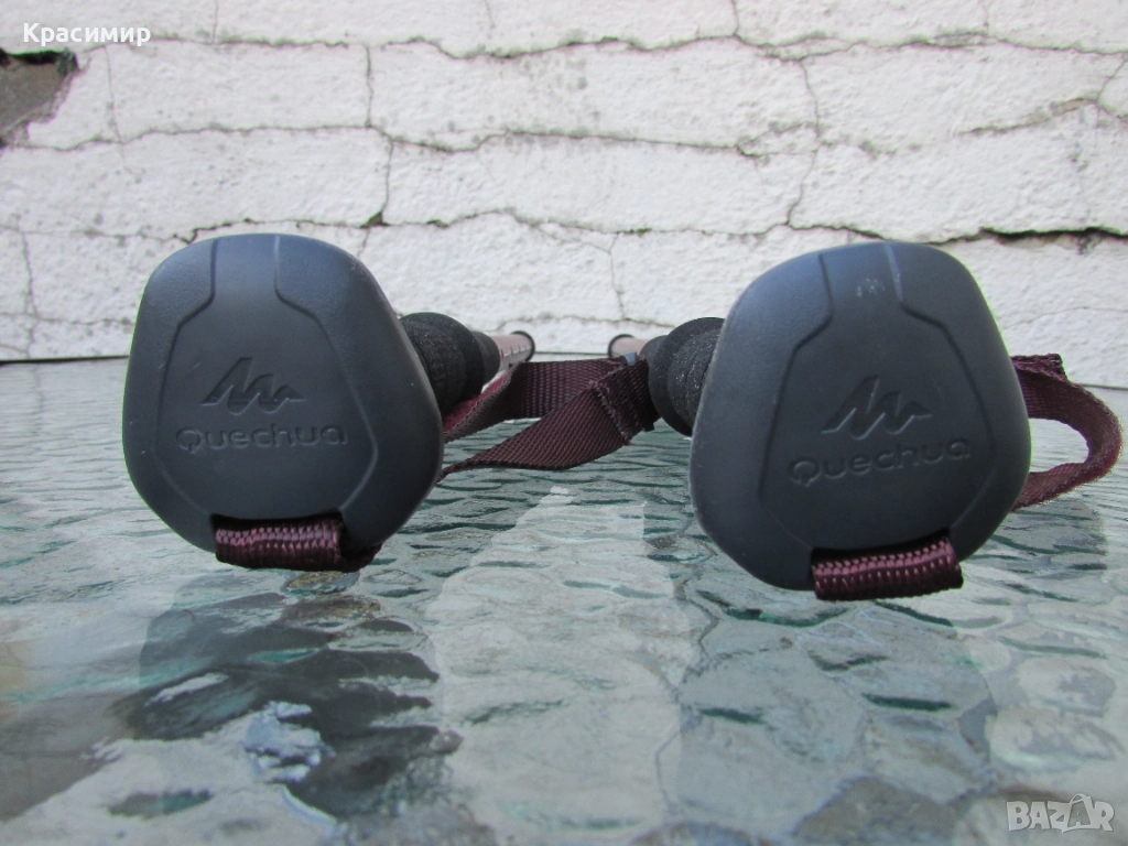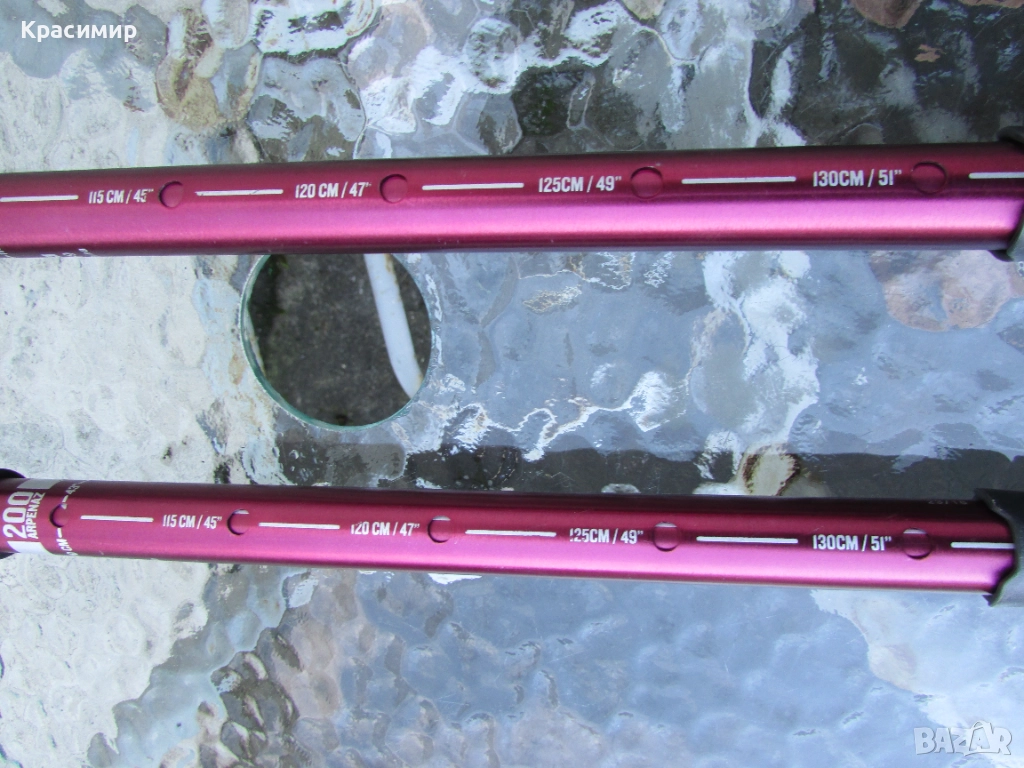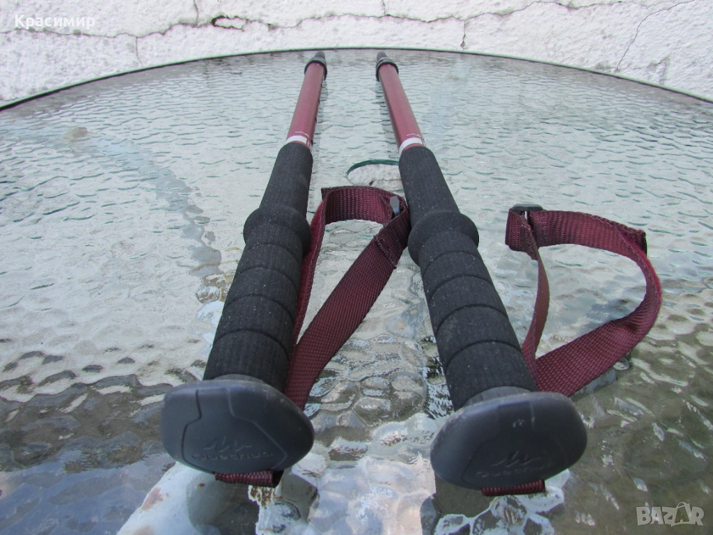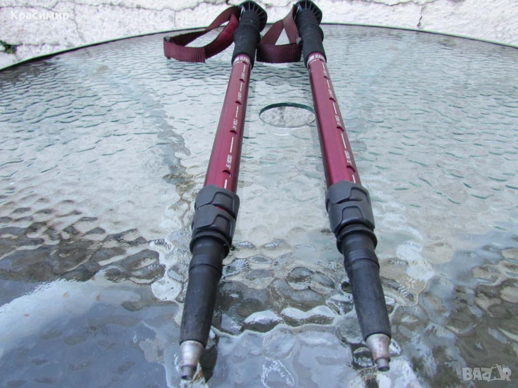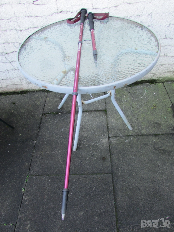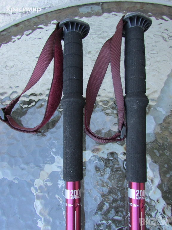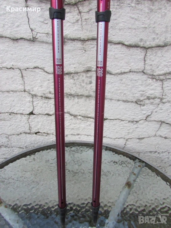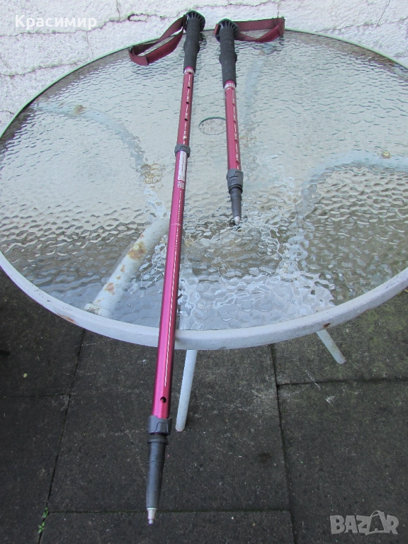 Щеки за туризъм Decathlon Arpenaz 200, в цвят розов металик, в перфектно състояние. Изработени са от алуминий, волфрамов връх, мека пяна на дръжката, против изпотяване и регулеруема каишка за китката за стабилност. С много лесна и надеждна система на заключване - с щифт. Разтягат се на 3 секции: Първа секция - сгънато положение - 56 см, втора секция - 93 см и трета секция - 130 см.