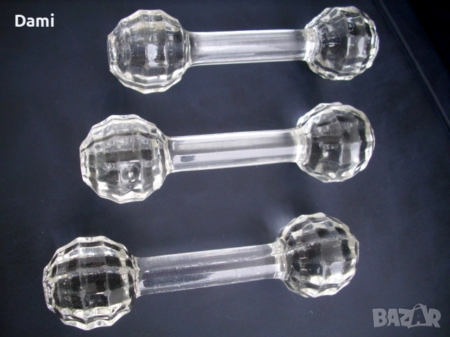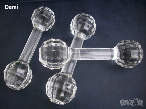 Комплект 3 броя тежести от фасетирано масивно кристално стъкло с форма на дъмбел. Предназначение: аксесоар за прибори или салфетки за маса. Германско производство около 1918-1920 год. Леки следи от употреба, видни на снимките. Размери: дължина 12 см, диаметър на топчетата 3 см.