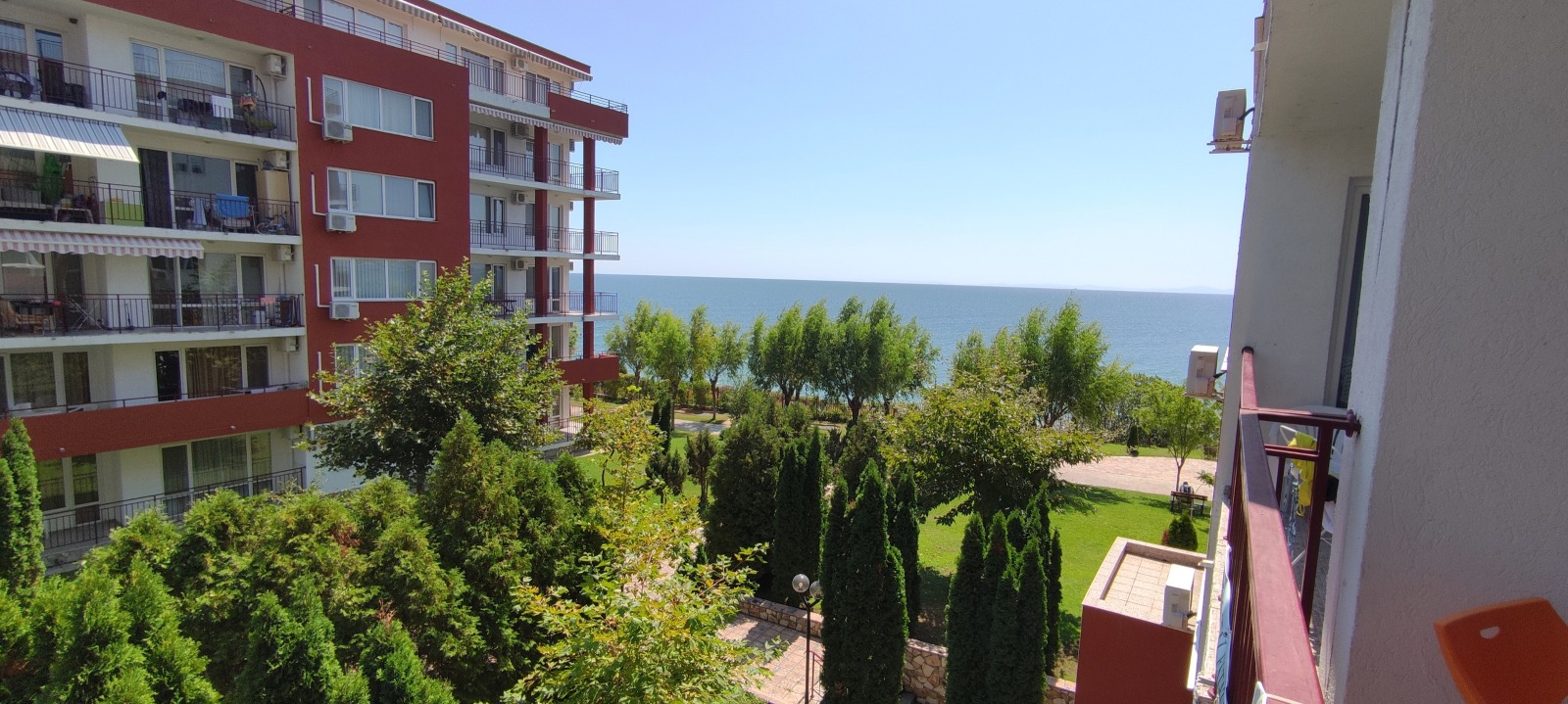 Двустаен апартамент 76 м2 на идеална 1-ва линия с красива гледка към морето. Прозорци на юго-изток. Перфектна гледка към морето в комплекс Марина Форт Нокс Свети Влас ПОД НАЕМ.
