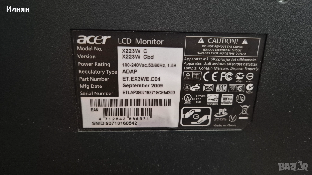 Продавам монитор ASER модел X223W → Обява 52946552