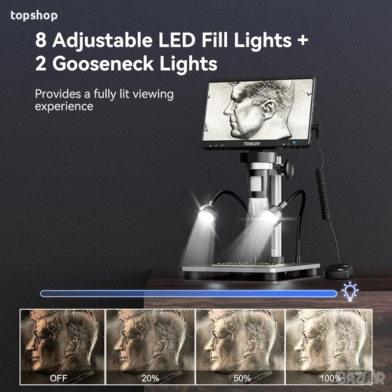 Увеличение от 5X до 1200X: Позволява ви да увеличавате мащаба и да наблюдавате най-малките детайли с диапазон на увеличение от 5X до 1200X. 8-те LED светлини за запълване, плюс 2 допълнителни светлини тип „гъша шийка“, осигуряват добре осветен изглед. Действителното увеличение варира в зависимост от размера на екрана и разстоянието между камерата и обектите.