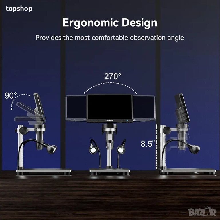 7-инчов въртящ се FHD екран: Оборудван с 12MP ултрапрецизна фокусираща камера и 1080P изображения с висока разделителна способност, този LCD дигитален микроскоп заснема висококачествени изображения и видеоклипове, осигурявайки невероятно микроскопско изживяване. Въртящият се (90 градуса) дизайн на екрана подобрява ергономичността и намалява напрежението в очите и врата.