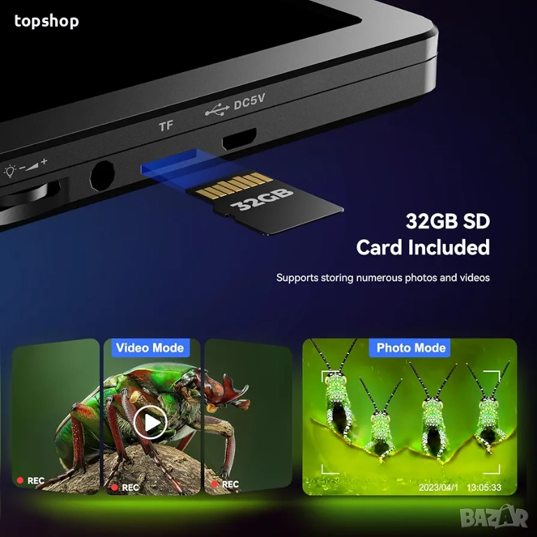 Включена 32GB SD карта: Тази лупа за монети със светлина включва 32GB Micro SD карта, която ви позволява да съхранявате множество снимки и видеоклипове. Натиснете и задръжте бутона за меню за 3 секунди, за да превключвате между режими „Снимане“, „Видеозапис“ и „Възпроизвеждане“ (Моля, обърнете внимание: За да предотвратим загубата на Micro SD картата, ние сме я инсталирали предварително в слота за Micro SD карта на микроскопа).