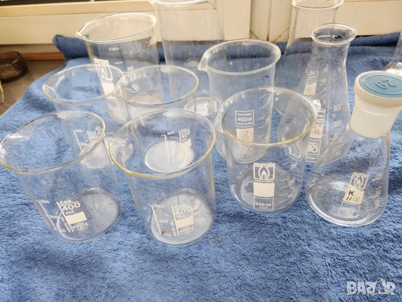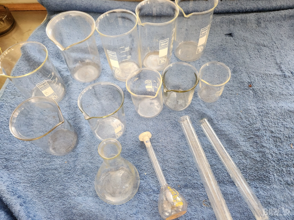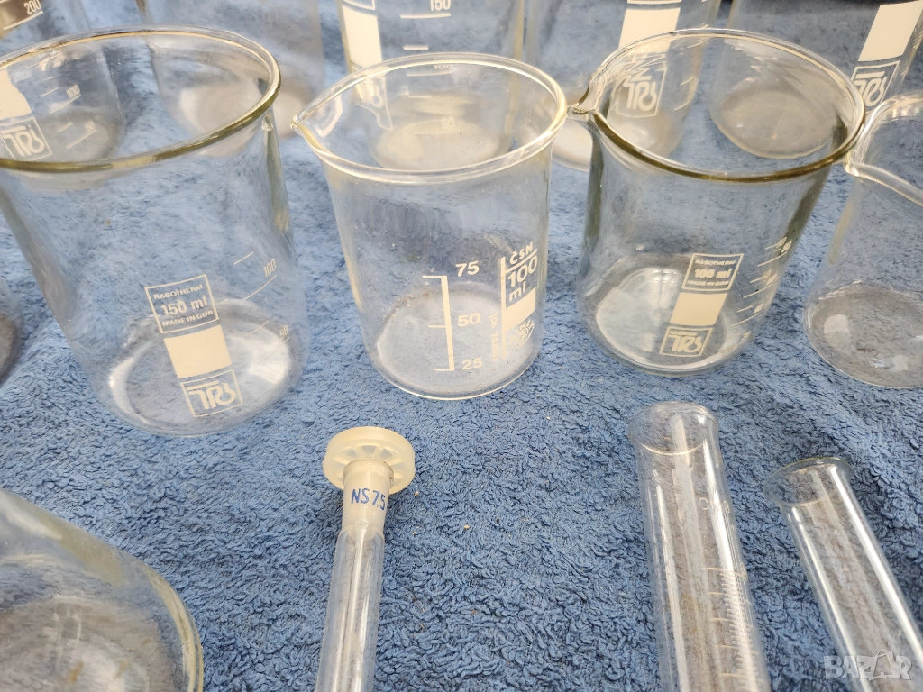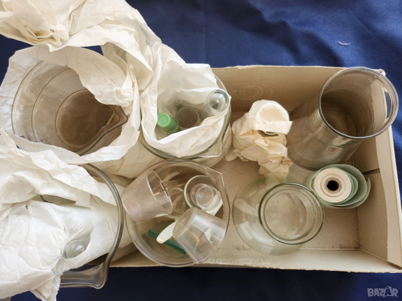 чаши, мензури, колби - лабораторно термоустойчиво стъкло, ГДР и Чехия, също 50 порцеланови лаб.чашки