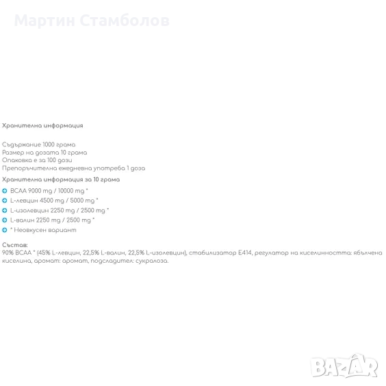 Верижно-Разклонени Аминокиселини 4500 g, от които L-левцин 2250 mg, L-валин 1125 mg, L-изолевцин 1125 mg