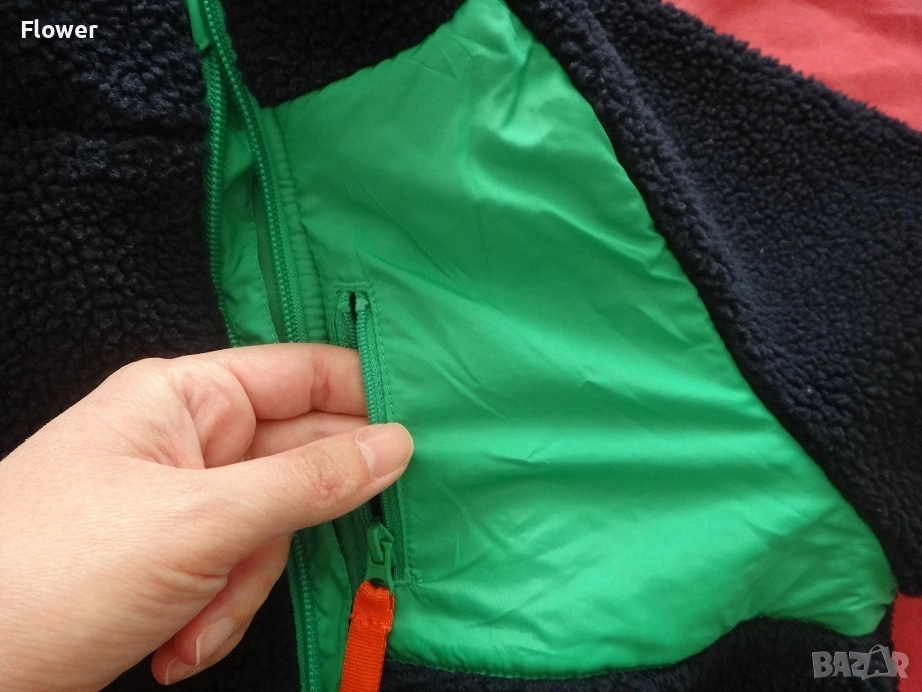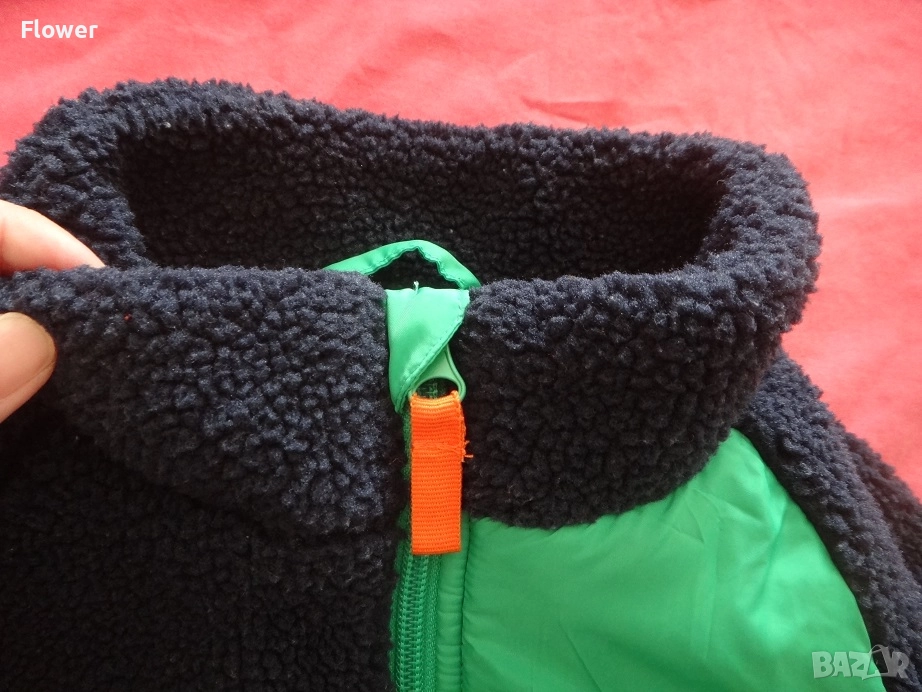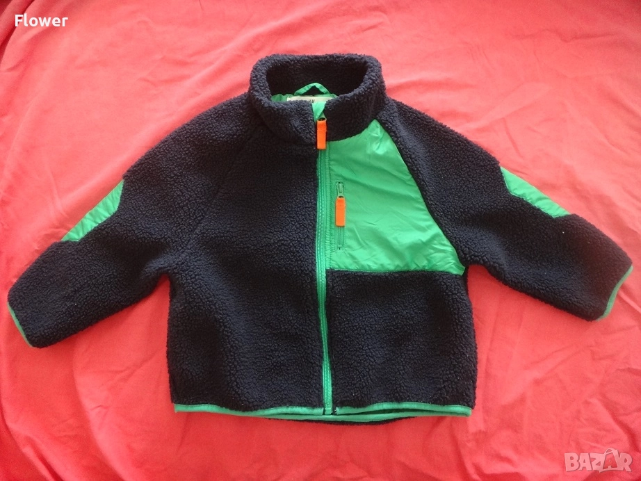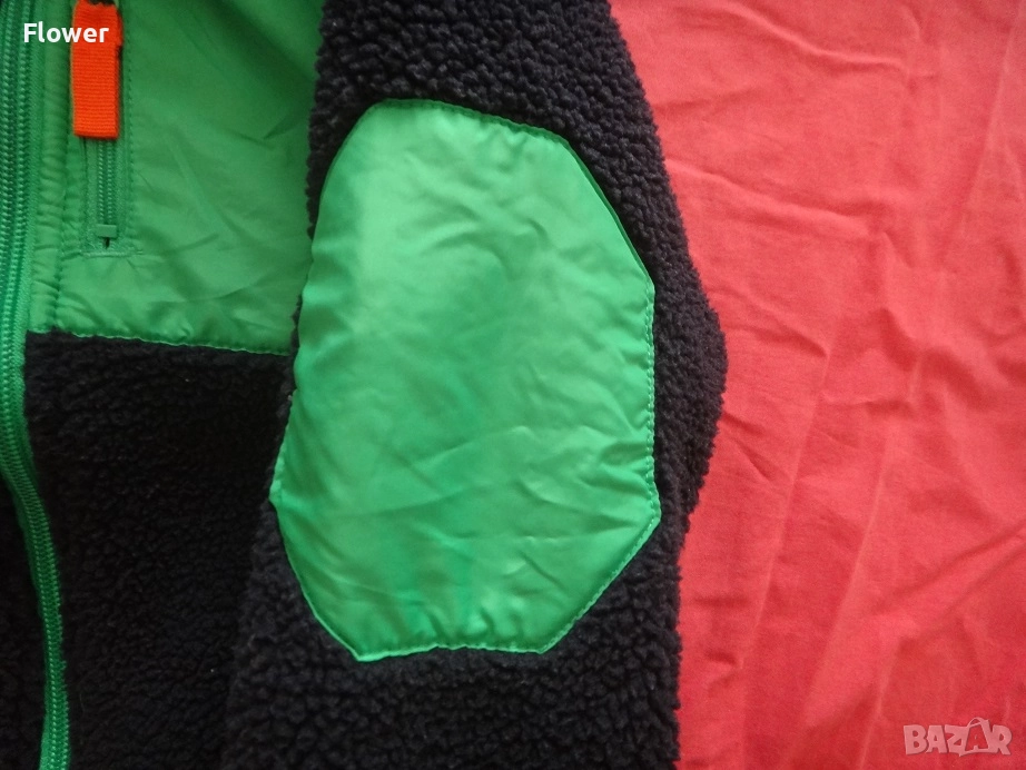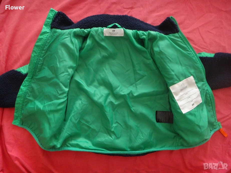 Яке от мека мъхеста материя със столче яка и цип отпред с предпазител за брадичката. Със свободна кройка, дълги реглан ръкави и джобове в страничните шевове. С кръпки на лактите и преден джоб от тъкана материя с цип. С подплата.