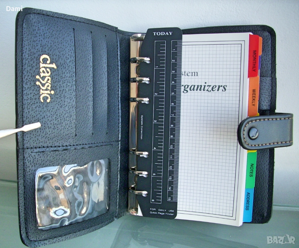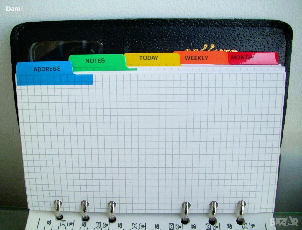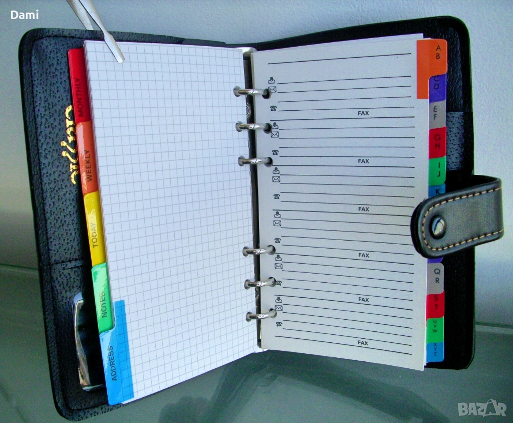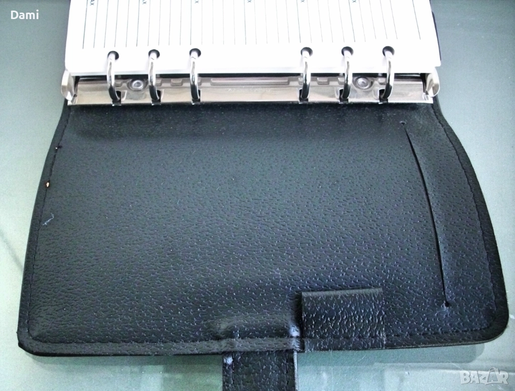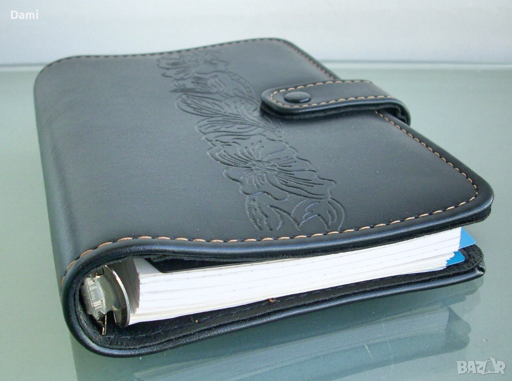Луксозен органайзер с твърди корици от екокожа с преге печат, спирала с 6 ринга, място за химикалка, 100 листа луксозна хартия /полукартон с цветни показалци, разграфена на редове и с възможност за подмяна, лесно подвижен дневен показалец, комбиниран с линийка, места за визитки и карти. Нов, без забележки. Наличен един брой. Размери 130 х 185 х 30 мм. Цвят черен с декоративни контрастни шевове.
