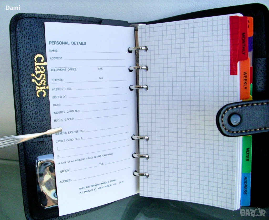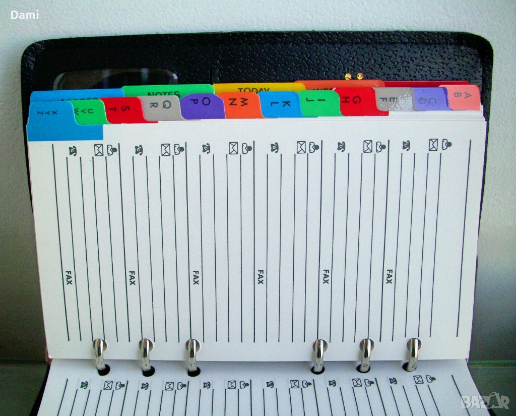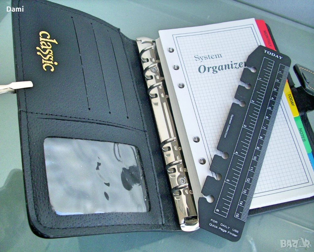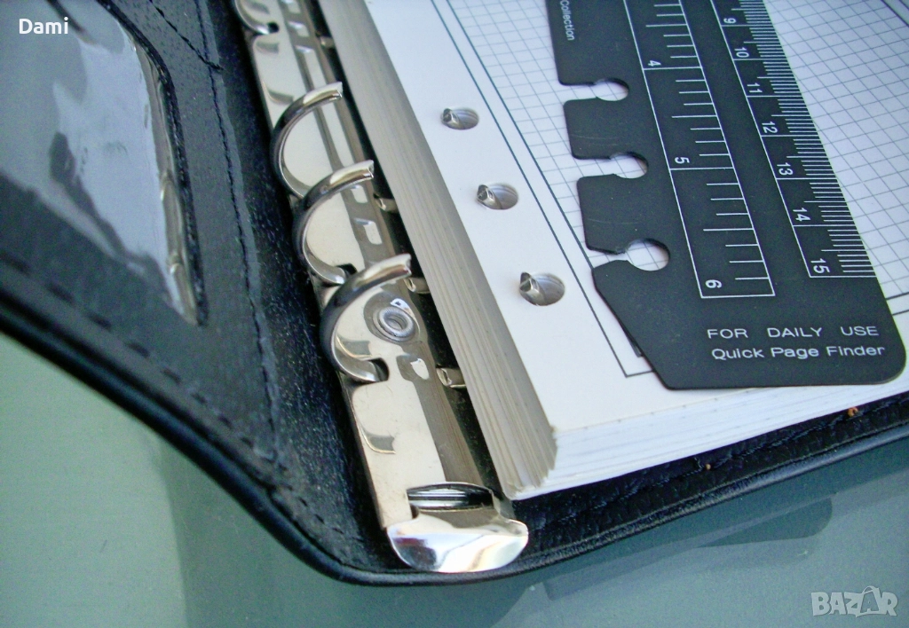 Луксозен органайзер с твърди корици от екокожа с преге печат, спирала с 6 ринга, място за химикалка, 100 листа луксозна хартия /полукартон с цветни показалци, разграфена на редове и с възможност за подмяна, лесно подвижен дневен показалец, комбиниран с линийка, места за визитки и карти. Нов, без забележки. Наличен един брой. Размери 130 х 185 х 30 мм. Цвят черен с декоративни контрастни шевове.