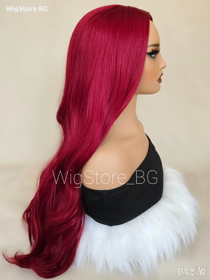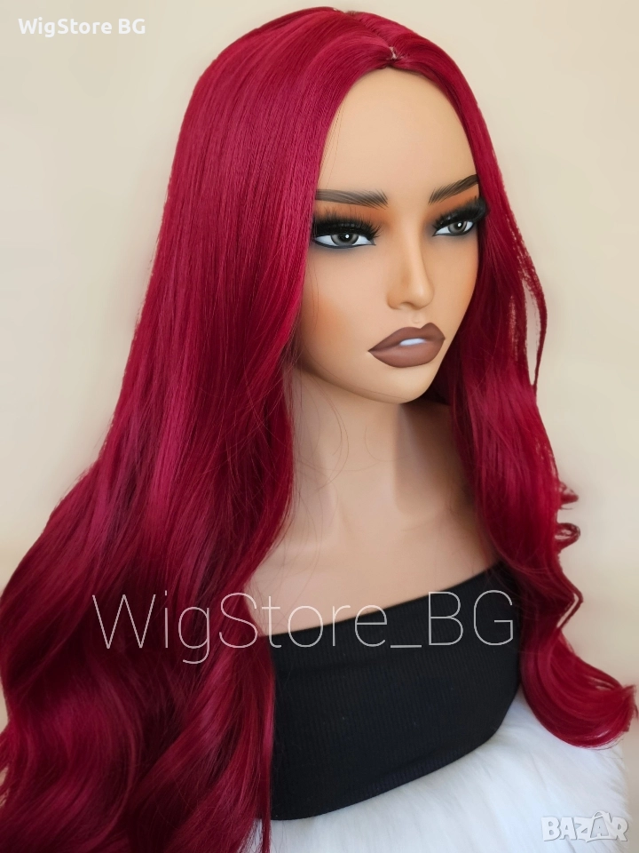 Дълга червена перука без бретон на леки къдрици → Обява 52948810