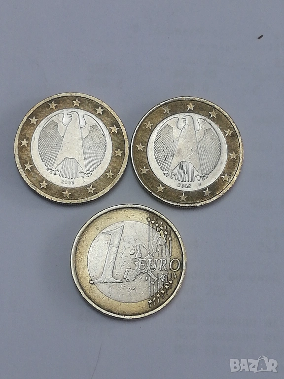 3 монети от 1 евро-Германия-2002 г. букви-A;F;J тези монети се секат в 5 различни монетни двора и са съответно с различни букви-A;D;F;G;J в прилично състояние.цена за лота 15 евро. изпращам само по еконт.