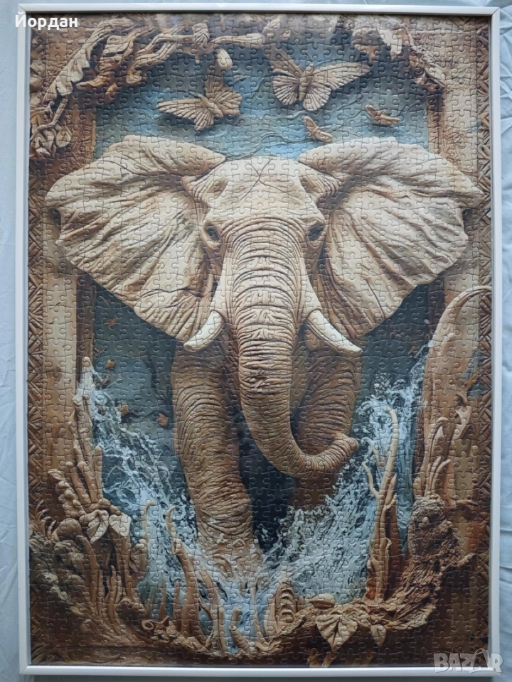 Сюжет: Картината изобразява масивен слон в динамична поза, преминаващ през вода. Стилът имитира детайлна дърворезба с 3D ефект, допълнен от нежни елементи като пеперуди и рамка от растителни орнаменти.