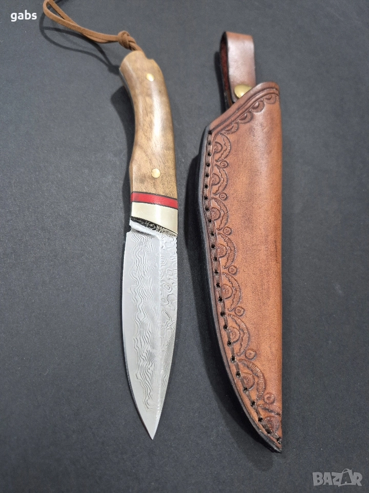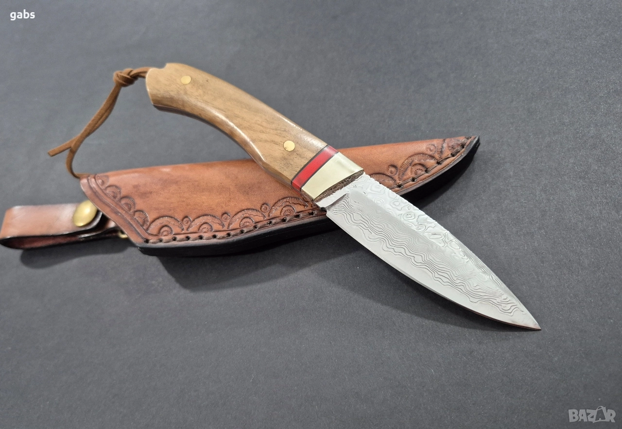 нож, изработен от дамаска стомана VG10. Неговият фултанг дизайн гарантира здравина и надеждност при всяка употреба. Удобната дървена дръжка осигурява сигурен захват, а наличието на отвор за връзка добавя допълнително удобство. Комплектът включва елегантна кожена кания за сигурно съхранение и лесно пренасяне. Това е прецизен инструмент, създаден да отговори на високите очаквания на всеки ловец.