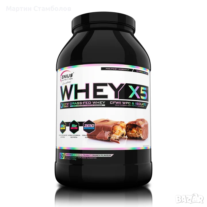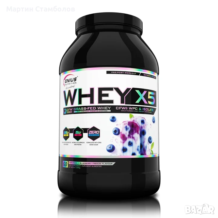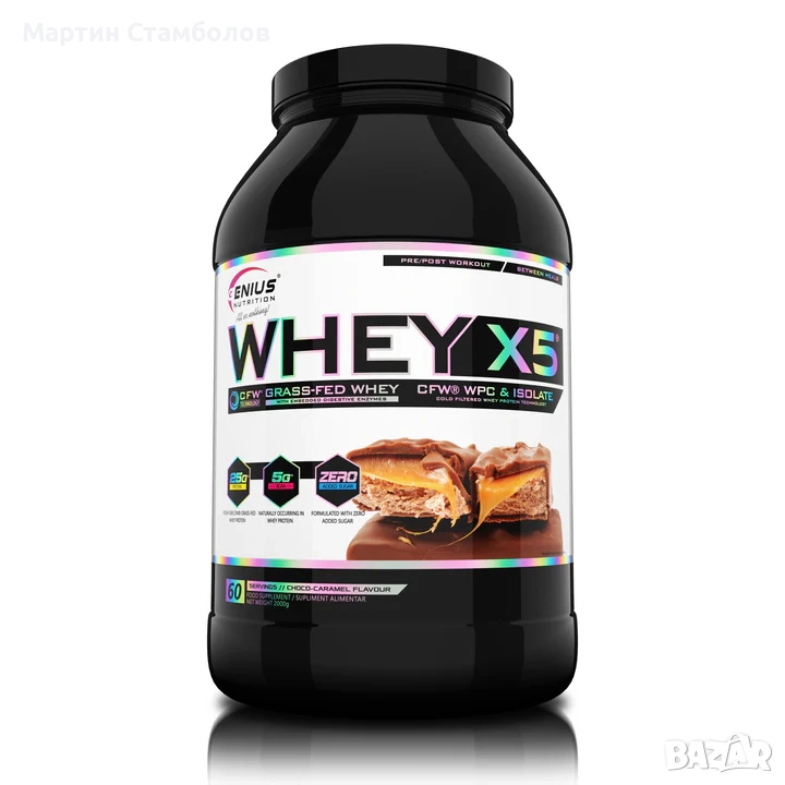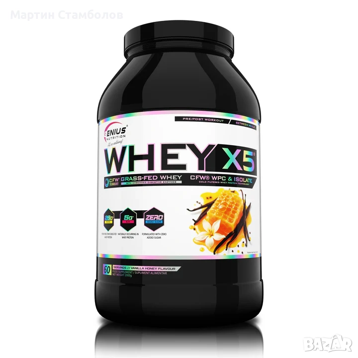 WHEY-X5 е прецизно формулиран за подпомагане на растежа и поддържането на безмазнинна мускулна маса. Това се постига чрез бързо усвояване на суроватъчния протеинов изолат и концентрат. Използваме най-добрия аминокиселинен профил и висока доза BCAA на доза, които се срещат естествено в суроватъчния протеин. Genius Nutrition използва висококачествен 100% суроватъчен протеин, получен чрез естествена филтрация, който има високи усвояващи и храносмилателни свойства, в комбинация с DigeZyme® (храносмилателни ензими). WHEY-X5® притежава отлични хранителни свойства, които са важни за всеки, който иска да изгражда мускули без да натрупва мазнини, като добавя и вкус.