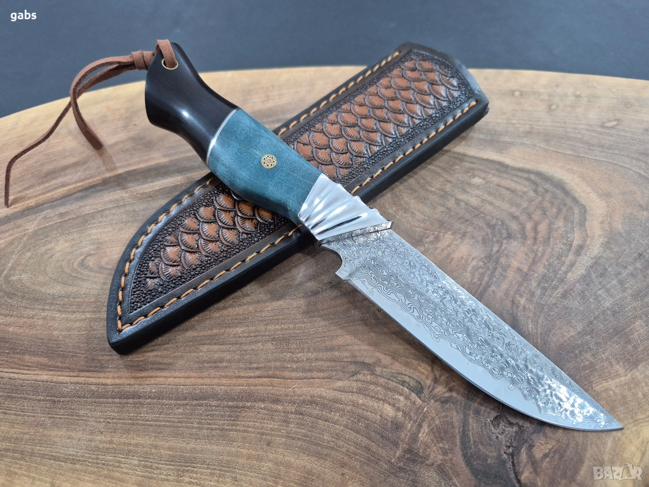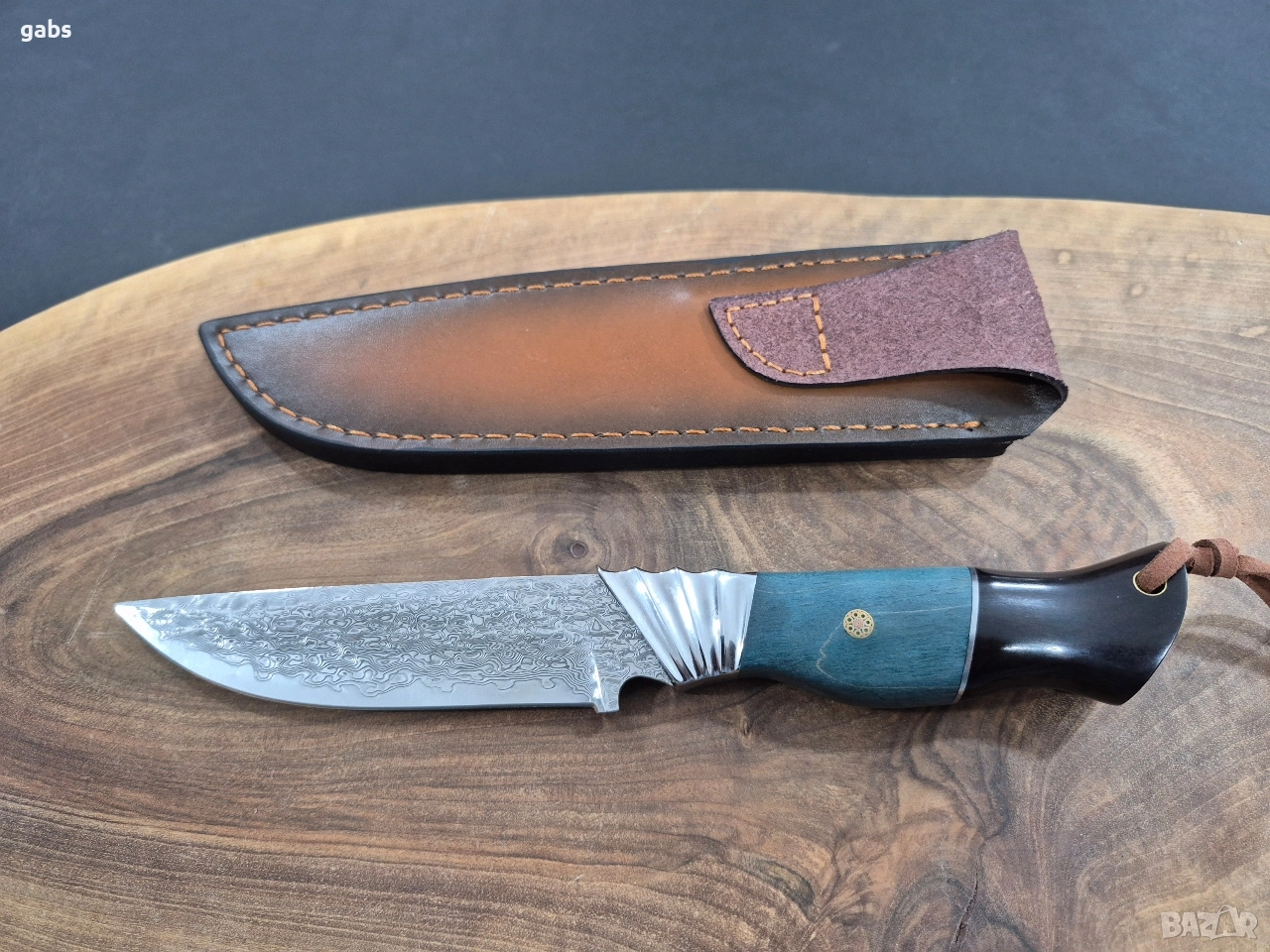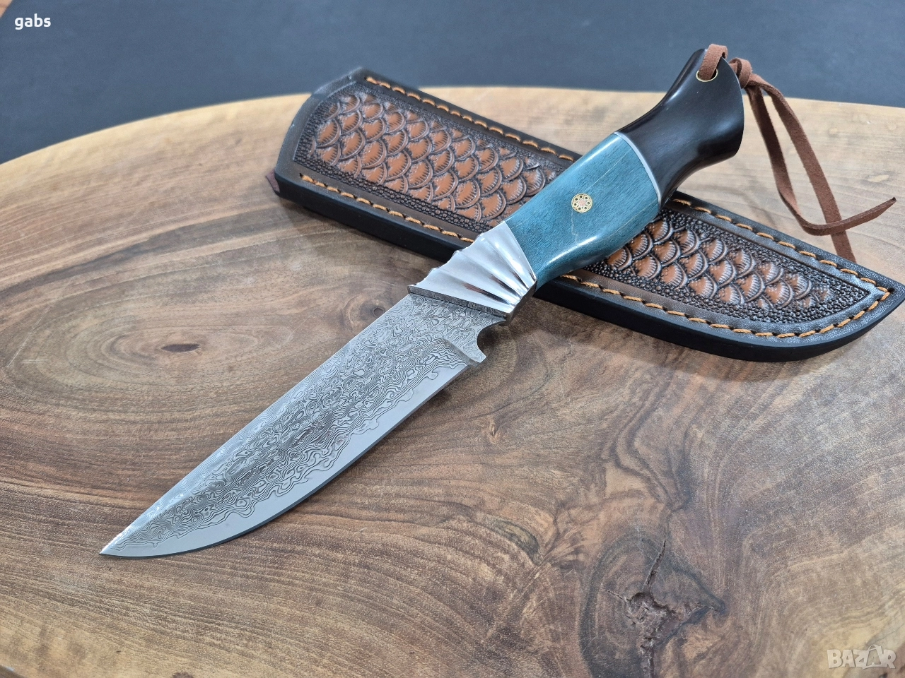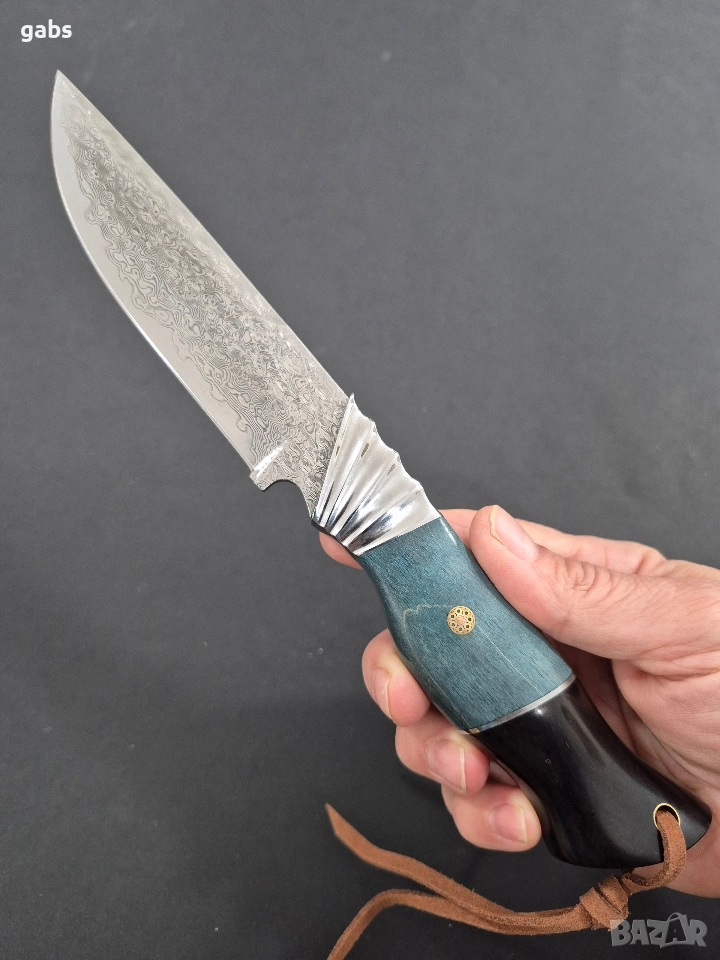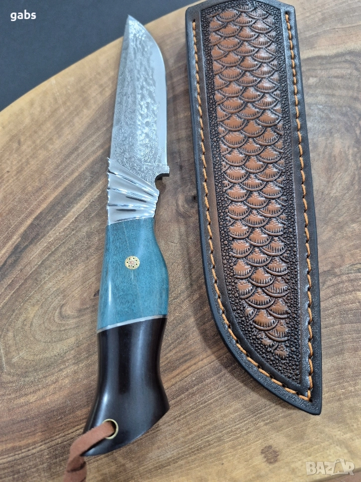 Ловен нож дамаска VG10 стомана,уникална дръжка и кожена кания,LN436