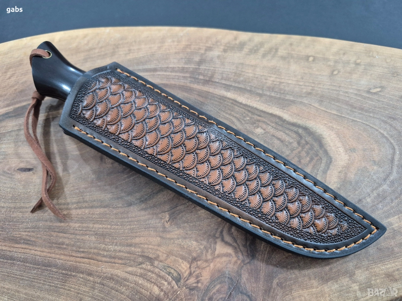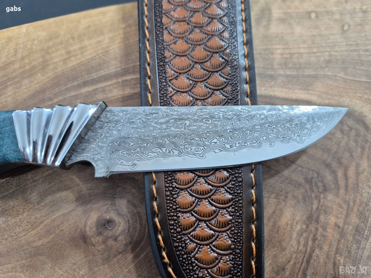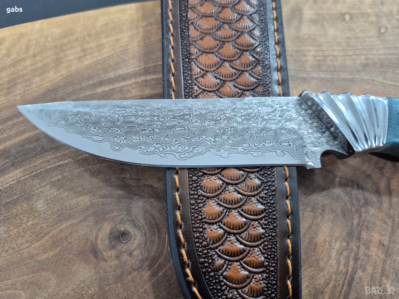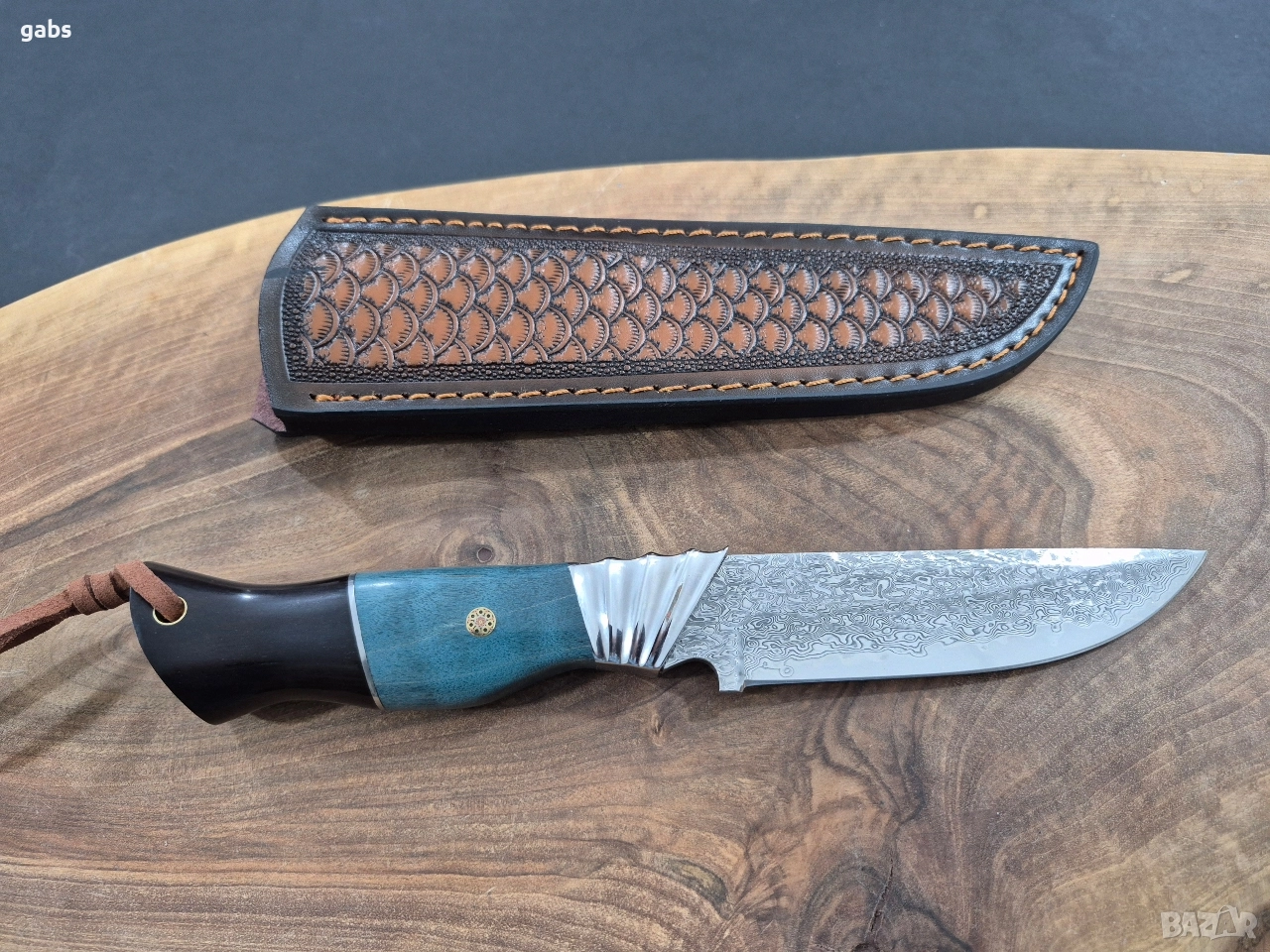 Ловен нож дамаска VG10 стомана,уникална дръжка и кожена кания,LN436