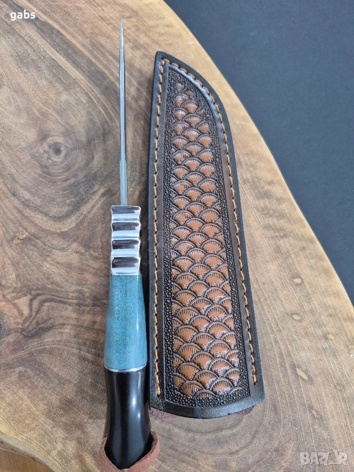 дамаска стомана. Комбинираната дръжка от четири различни материала осигурява отличен захват и комфорт. Всеки детайл е внимателно обмислен за максимална функционалност и естетика. Този нож е перфектното допълнение за всеки ценител на качествени инструменти. Включена е и елегантна кожена кания за безопасно съхранение.