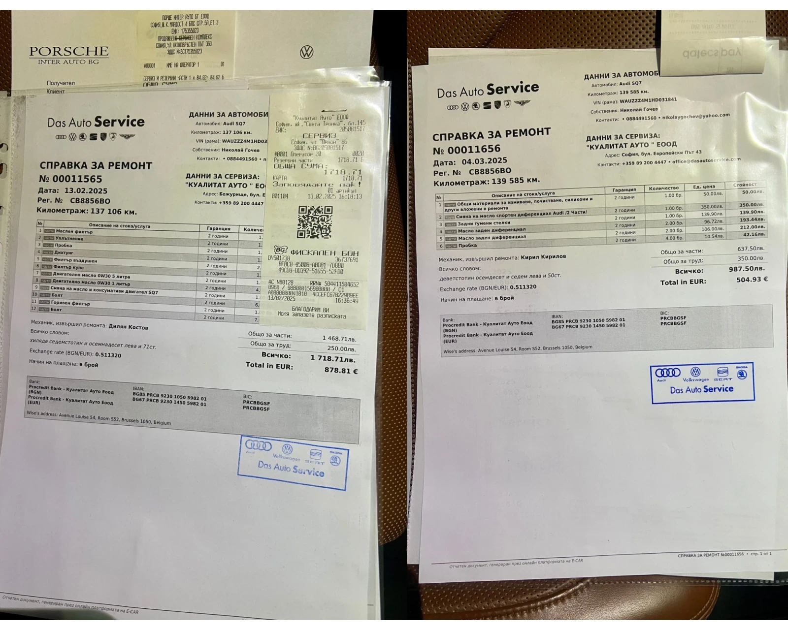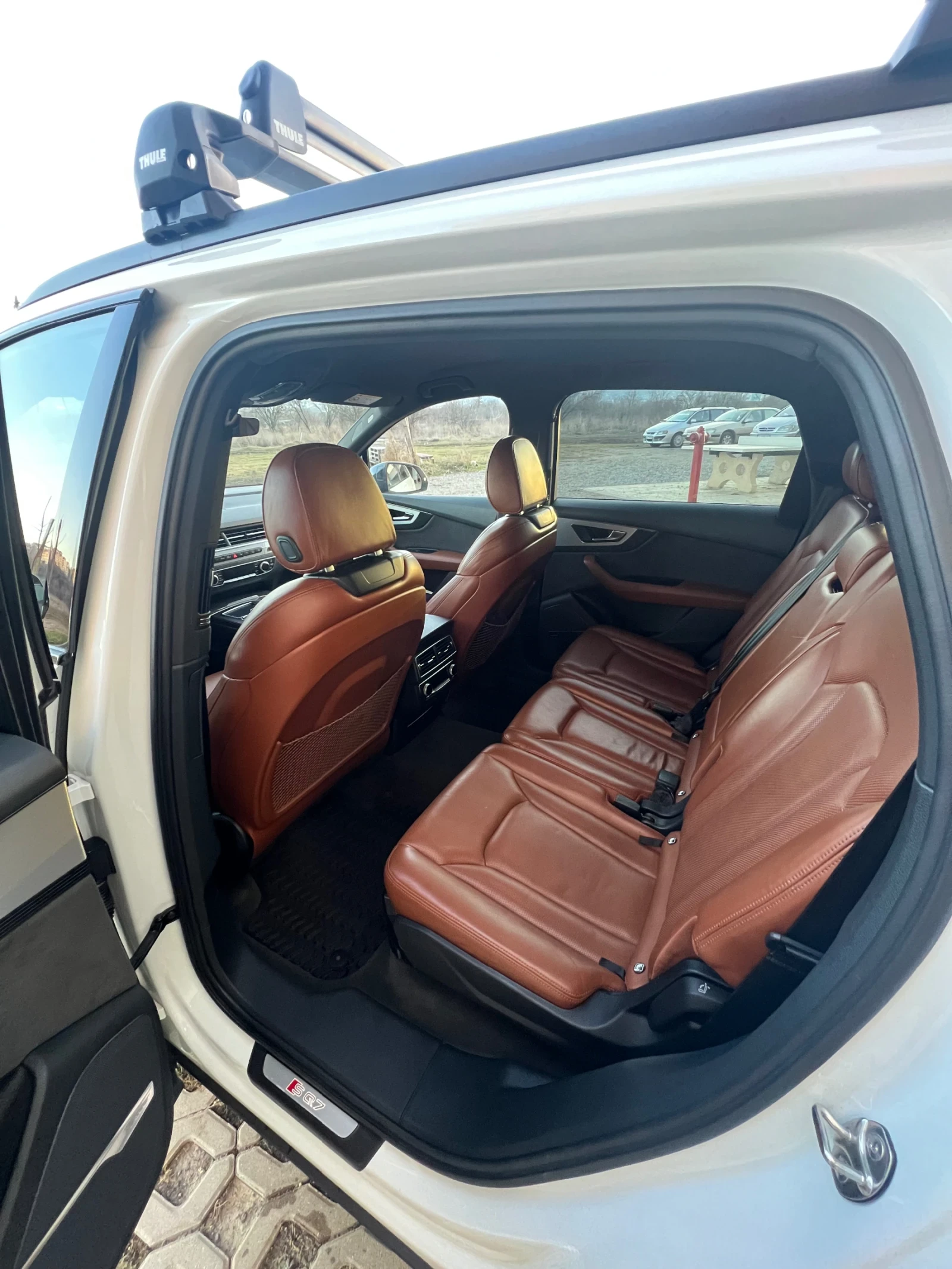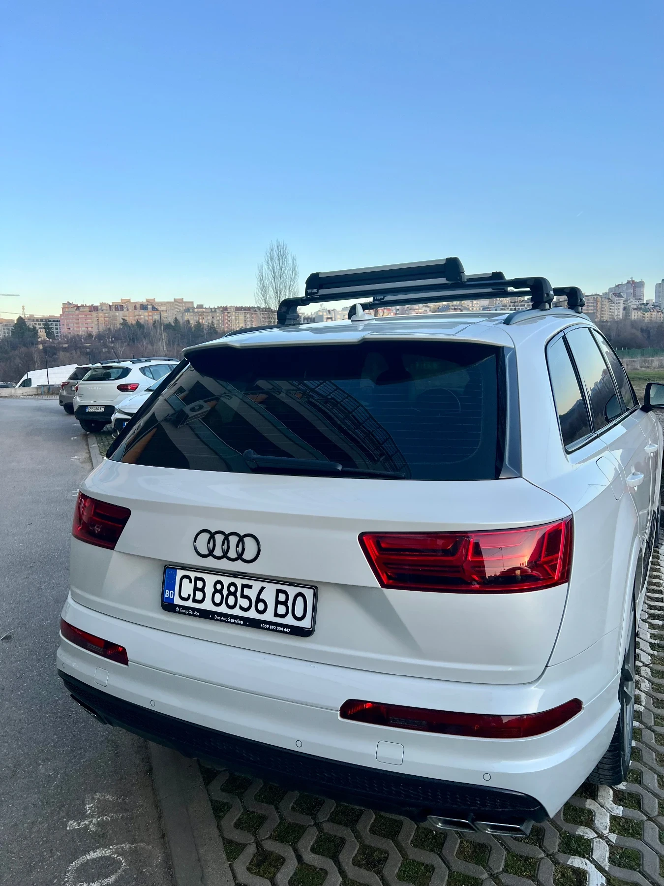 AUDI SQ7 4. 0 TDI V8T Quattro 435 к. с. Личен автомобил, кара се ежедневно. Автомобилът е закупен от Германия с история в Ауди. Обслужван е само в Das Auto Service в България. Екстериор: - Цвят Трислойна Бяла перла - Алуминиеви джанти 21 RS (Audi Sport), с гуми 285/40 R21 - Спирачни апарати Audi Sport - Теглич - електрически + Асистент за ремарке Интериор: - Кожен салон Valcona в кафяво - индивидуални контурни седалки в кафяво - Масажна функция на предните седалки - Подгряване на предните и задни седалки - Обдухване на предните седалки - Електрическо регулиране на предните седалки - Въздушни възглавници - предни, странични и странични за пътниците на втори ред седалки - Пакет амбиентно осветление - Мултифункционален спортен кожен волан - BOSE Sound System с 15-канален усилвател, 558W - Дигитален радиоприемник - Audi Phone Box със свързване с антената на автомобила и wireless зареждане - Audi Smartphone Interface (CAR Play) - Virtual cockpit 12. 3 HD цветен дисплей - Йонизатор за въздух в купето - 4 зонов Климатроник - Навигационна система MMI Navigation - Bluetooth interface - Audi connect с WiFi hotspot (свързване чрез sim карта) Комфорт: - Вакуум/Сервоусилвател на вратите - Външни огледала с електрическо регулиране, подгряване и автоматична бленда - Двойни шумоизолиращи стъкла (предно, задно, странични) - Сензорно отваряне на багажника - Електрическа щора на багажника - Подгряване на волан - Печка с настройване на график и дистанционно - Isofix Окачване: - Quattro със спортен диференциал - All wheel steering - 4 завиващи колела - 4 corner Air suspension with electric shock absorption control Светлини: - Audi Matrix LED светлини - къси, дълги и дневни - Динамичен асистент за дългите светлини - Система за почистване на фаровете - Функция за шофиране при лоши метеорологични условия Системи: - Head-up display - Virtual cockpit 12. 3 HD цветен дисплей - Night Vision Аистент за нощно виждане, засичащ пешеходец и животни - Audi Pre-Sense - Park assist Система за паркиране - Side assist с Audi Pre Sense rear - Adaptive cruise control - Stop&Go включително Pre Sense front - Система за разпознаване на пътните знаци - Predictive efficiency assist - Distronic Distance control - Active lane assist - Traffic assistant - активен при скорост от 0 до 60 km/h - Turn assist - активен при скорост от 2 до 10 км / ч , подпомага шофьора при завой на кръстовище - Collision avoidance assist - подпомага водача при маневра за избягване на евентуален сблъсък с допълнително завиване на волана (до 3 Nm) - Алармена инсталация със защита против изтегляне - Имобилайзер - Застраховка Каско до 02/2026