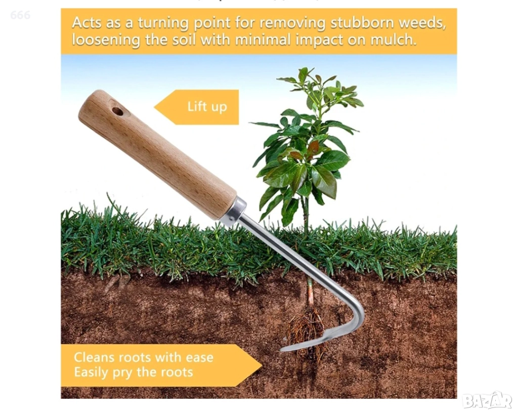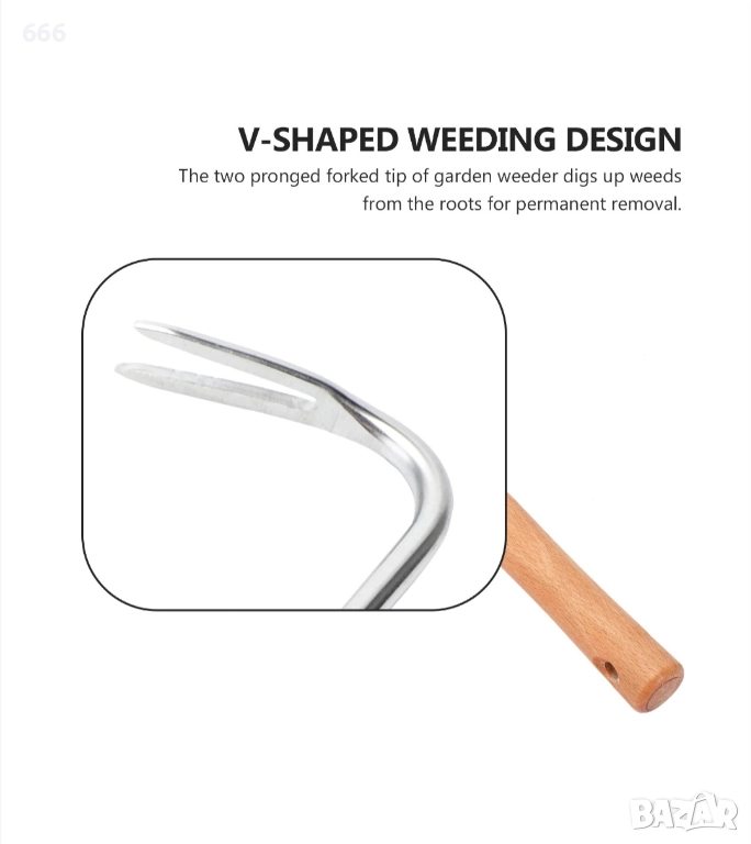 Изтънчен дизайн: V-образният дизайн улеснява проникването в земята. Градинският нокът с дръжка може да достигне корените на дълбочина 8 см и да премахва плевелите без усилие.