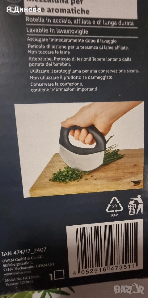 Продавам заоблен нож за подправки, чисто нов нее използван. Лесен за употреба и лесно нарязване на подправки, магданоз, мащерка,зелен лук и т.н. Внос от Германия.