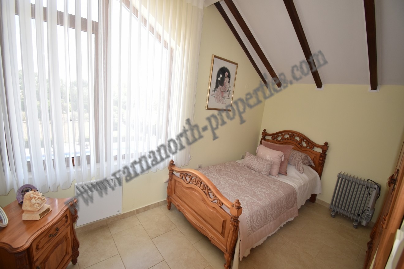 На горния етаж, просторен хол в момента служи като място за четене и свързва две спални - едната оборудвана с голямо гардеробно място, семейна баня и още една самостоятелна главна спалня със собствена баня и прекрасни гледки. В цялата къща мебелите от истинско дърво подчертават издръжливостта и семплирания стил, успокоявайки тези, които ценят дългосрочните инвестиции пред мимолетните тенденции.