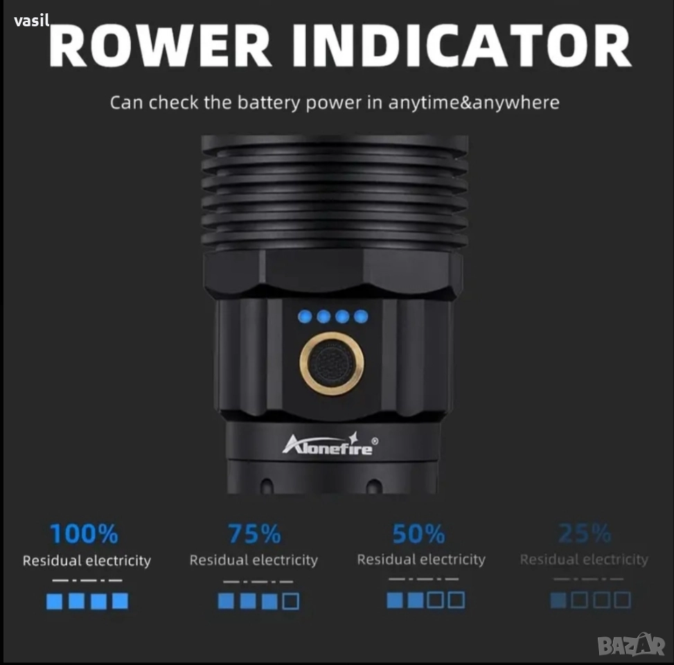 Продавам мощен LED фенер Alonefire X100 с изключително силна светлина и голям обхват. Подходящ за лов, риболов, къмпинг, охрана, работа на открито и аварийни ситуации. ✅ Характеристики: 💡 Мощност: до 5000 лумена 🔋 Вградена батерия – пакет 3×18650 (паралелно) 🔌 USB Type-C зареждане (телефонно зарядно, лаптоп, power bank, кола) 🔦 Концентриран далекобоен лъч 📊 Индикатор за батерията (25% / 50% / 75% / 100%) 🖐 Удобен и стабилен захват 🛠 Здрав алуминиев корпус 📏 Размери: около 17 см дължина 📦 Комплектът включва: LED фенер Alonefire X100 Батерия 6600 mAh USB кабел