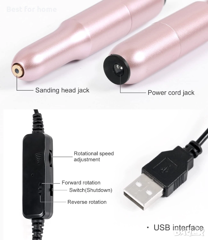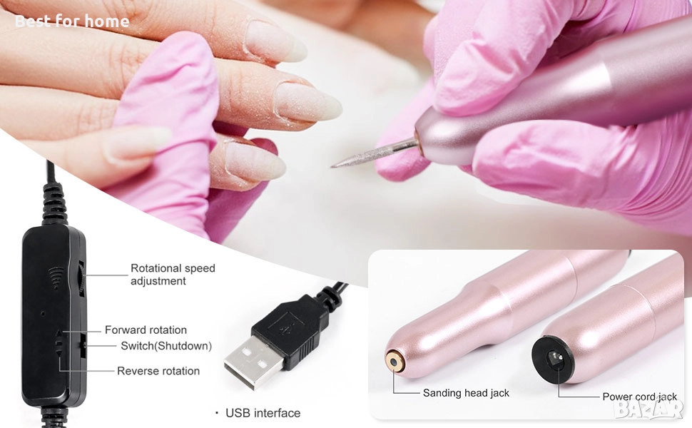 Електрическа пила за нокти - От 0 до 20 000 оборота в минута, можете да регулирате от ниска до висока скорост според вашите предпочитания. Лесна за носене и може да се съхранява в джоба ви. Свредлото се сменя много лесно без инструменти, просто го извадете и поставете.