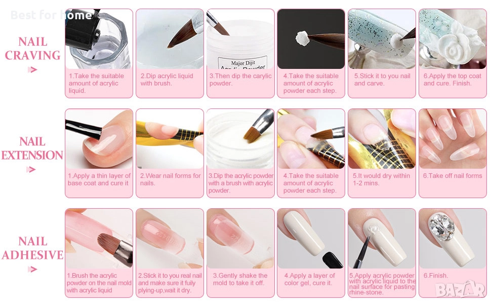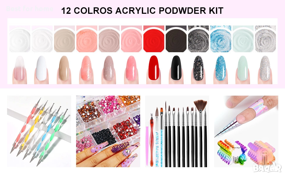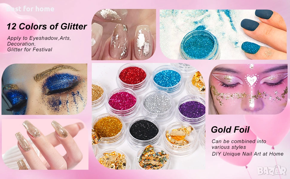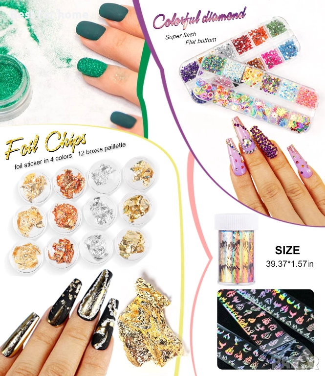 Комплект за дизайн на нокти „Всичко в едно“ - Включва 36W UV LED лампа за нокти, пили за нокти, брокат за нокти, акрилна пудра, професионална електрическа бормашина за нокти, форма за нокти, препарат за премахване на нокти, накрайници за нокти, гел за нокти, четка за дизайн на нокти, 3D декорация за дизайн на нокти и др. С този комплект можете да задоволите повечето си изисквания.