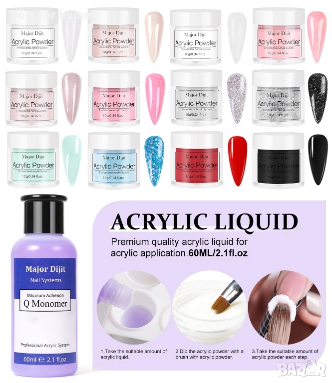 Голям комплект за нокти Major Dijit с лампа за нокти и пила, 0.35 oz бял, прозрачен, розов, черен и още 12 цвята акрилна пудра и течност, електрическа бормашина за нокти, брокат, четки за нокти, комплект за начинаещи