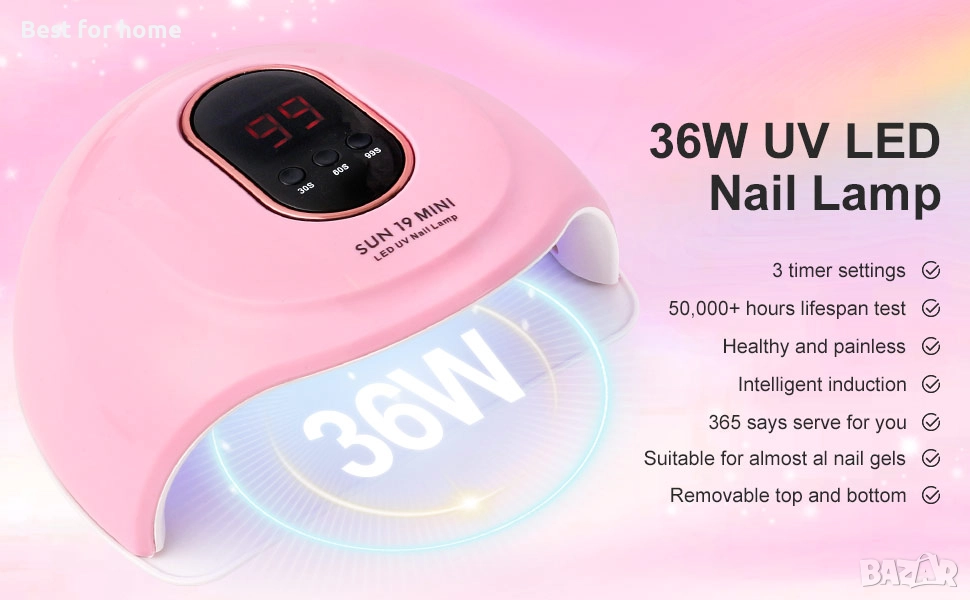 Бързосъхнеща 36W UV лампа за нокти - Може бързо да изсъхне лак за нокти, основен слой и топ лак. Със супер функция, UV и LED две в едно + интелигентна функция за автоматично разпознаване + без изгаряне + защита на очите + пестене на енергия + 3 настройки на таймера (30s, 60s, 99s), за да се гарантира качеството и ефектът на всички дизайни на нокти.