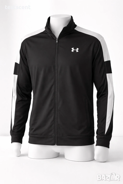 Продавам оригинално мъжко спортно горнище Under Armour, размер XL. Моделът е тип тренировъчно горнище с права кройка, удобно за спорт и ежедневно носене. Закопчава се с цип по цялата дължина и има висока яка. Цветът е черен, с бели панели/ленти по ръкавите, както се вижда на снимките. Материята е лека и гладка, подходяща за пролет, есен и по-хладни летни вечери, както и за загрявка преди тренировка.