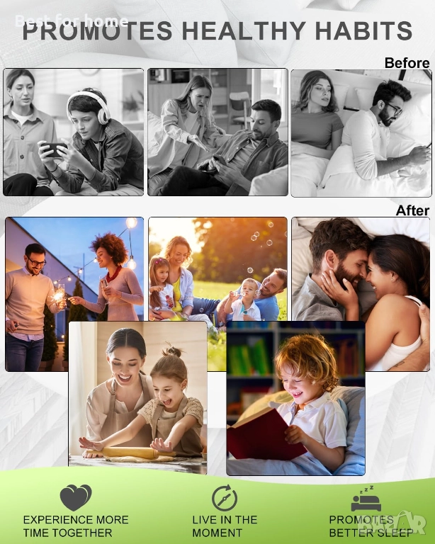 Четирипанелен инфографика за начина на живот, показваща дейности, обозначени като „Живот осъзнато“, „Здравословно и балансирано време пред екрана“, „Повишаване на производителността и фокуса“ и „Време с приятели и семейство“.