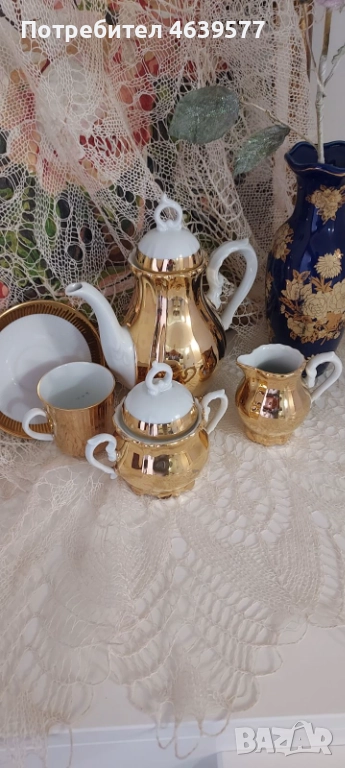 Комплектът включва чайник, захарница, латиера и сет за кафе, изработени от висококачествен порцелан с блестящо златно покритие. Без забележки.
