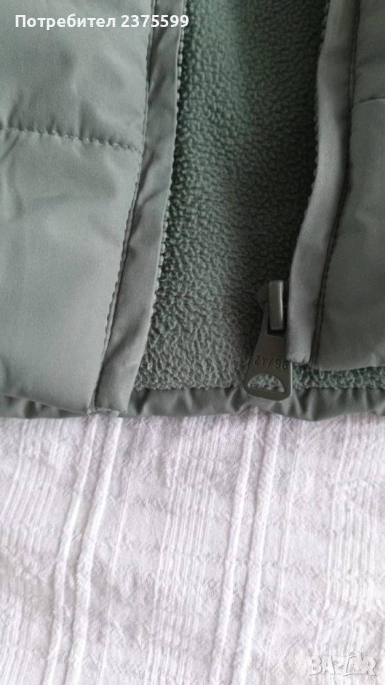 Шушлякова материя и е подплатено с лека вата. Хастарът е от полар. Качулката не се сваля. Много запазено. Носено е 1 месец. Без забележки.