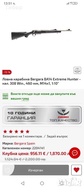 Ловна карабина Bergara BA14 Extreme Hunter - кал. 308 Win., 460 мм, M14x1, 1:10"